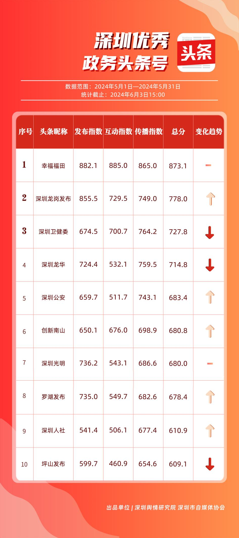 5月,“幸福福田”“深圳龍崗發(fā)布”“深圳衛(wèi)健委”“深圳龍華”“深圳公安”“創(chuàng)新南山”“深圳光明”“羅湖發(fā)布”“深圳人社”“坪山發(fā)布”共10個(gè)政務(wù)頭條號(hào)能夠及時(shí)發(fā)布政務(wù)信息及公共服務(wù)信息,服務(wù)經(jīng)濟(jì)社會(huì)發(fā)展,滿足公眾信息需求,位列“優(yōu)秀政務(wù)頭條號(hào)”榜單,《廣東人將挑戰(zhàn)暴雨上班30天》《幫朋友問:“口~”會(huì)不會(huì)傳染艾滋?。俊返葍?yōu)秀文章資訊深入人心。其他未上榜單位應(yīng)積極運(yùn)用該新媒體平臺(tái)助力政務(wù)公開,讓權(quán)威聲音有效傳播到目標(biāo)受眾,更好地服務(wù)人民群眾。