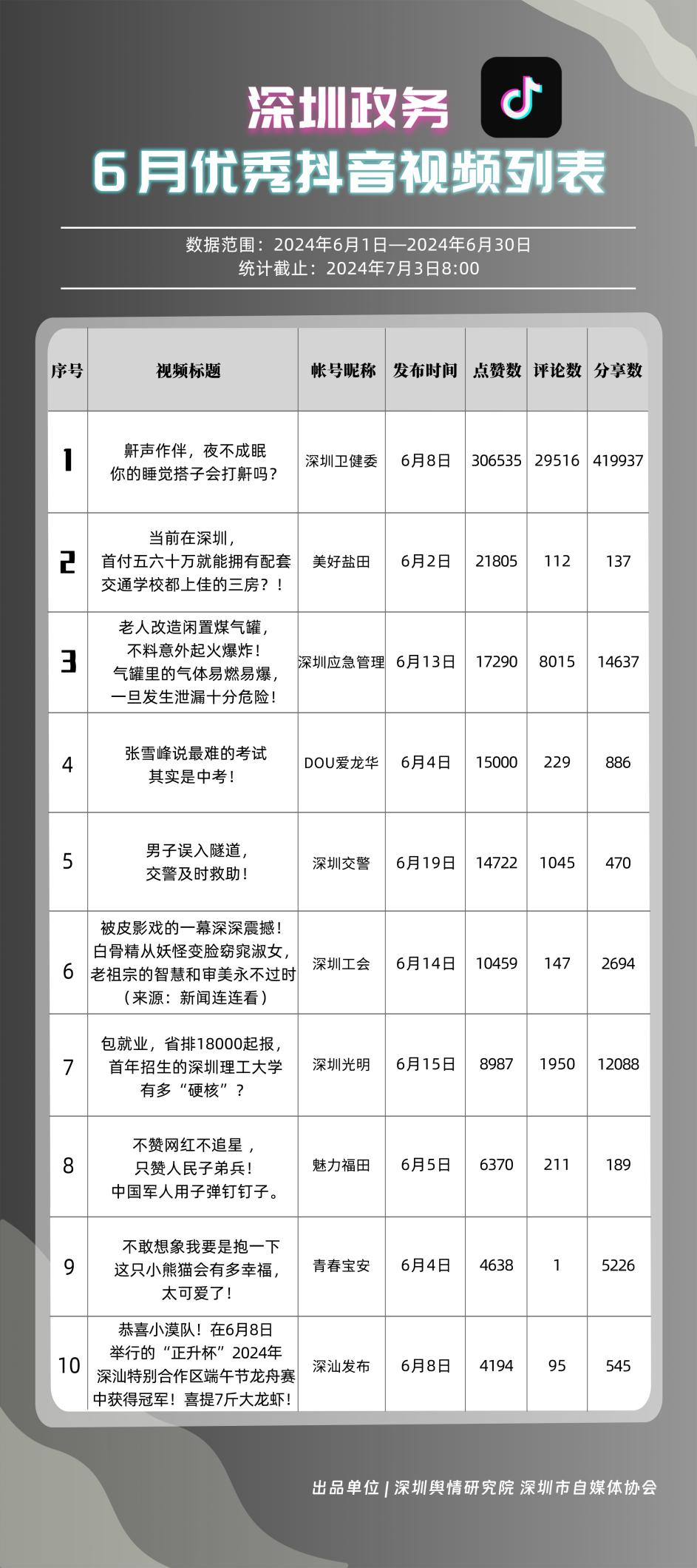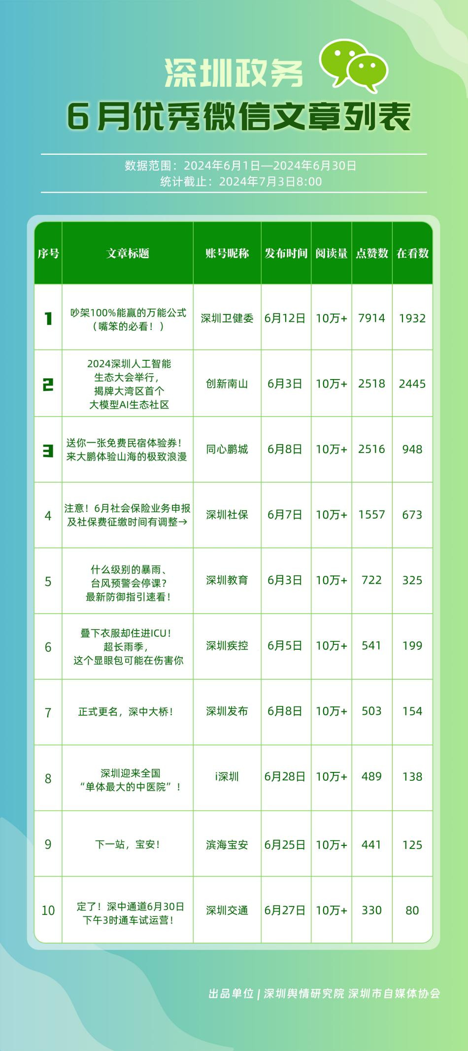 6月,“深圳衛(wèi)健委”“i深圳”“深圳龍崗發(fā)布”“幸福福田”“深圳交通”“深圳教育”“濱海寶安”“創(chuàng)新南山”“深圳工會”“青春深圳”“同心鵬城”“深圳光明”等30個政務微信公眾號,被評為“深圳優(yōu)秀政務微信公眾號”。6月,“深圳衛(wèi)健委”因內(nèi)容策劃出色、受眾互動活躍、作品火熱“出圈”等,榮登排行榜首位。“創(chuàng)新南山”“同心鵬城”“深圳社?!薄吧钲诮逃钡壬习窆娞栆卜e極創(chuàng)作優(yōu)質(zhì)作品,抓住時下熱點趨勢,集中發(fā)揮政務媒體傳播力量,推動了政務信息傳播工作提質(zhì)增效。
