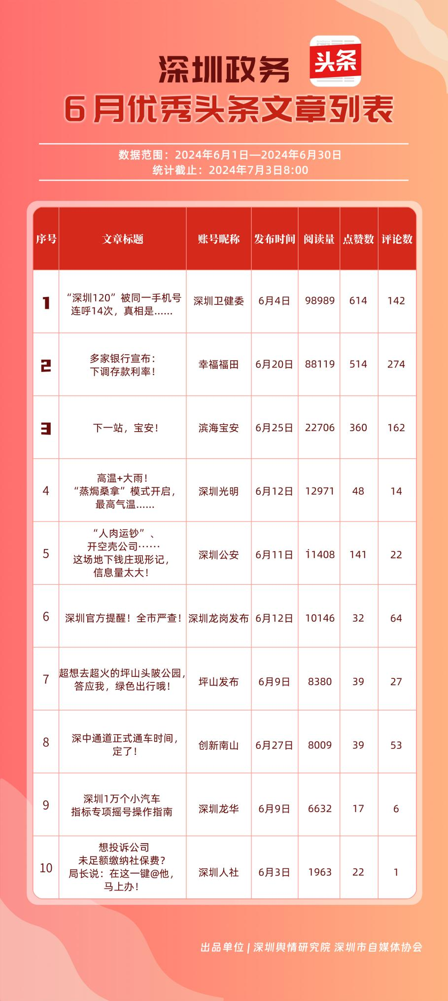 6月,“幸福福田”“深圳龍崗發(fā)布”“深圳衛(wèi)健委”“深圳光明”“濱海寶安”“深圳龍華”“創(chuàng)新南山”“坪山發(fā)布”“深圳公安”“深圳人社”共10個政務頭條號能夠及時發(fā)布政務信息及公共服務信息,入列“優(yōu)秀政務頭條號”榜單。從數(shù)據(jù)上分析,《“深圳120”被同一手機號連呼14次,真相是……》《多家銀行宣布:下調(diào)存款利率!》《下一站,寶安!》等優(yōu)秀文章為網(wǎng)民提供醫(yī)療急救、經(jīng)濟政策、區(qū)域發(fā)展等領域的信息,發(fā)揮各自賬號在信息傳播、公共服務等方面的重要功能,收獲較高點贊。