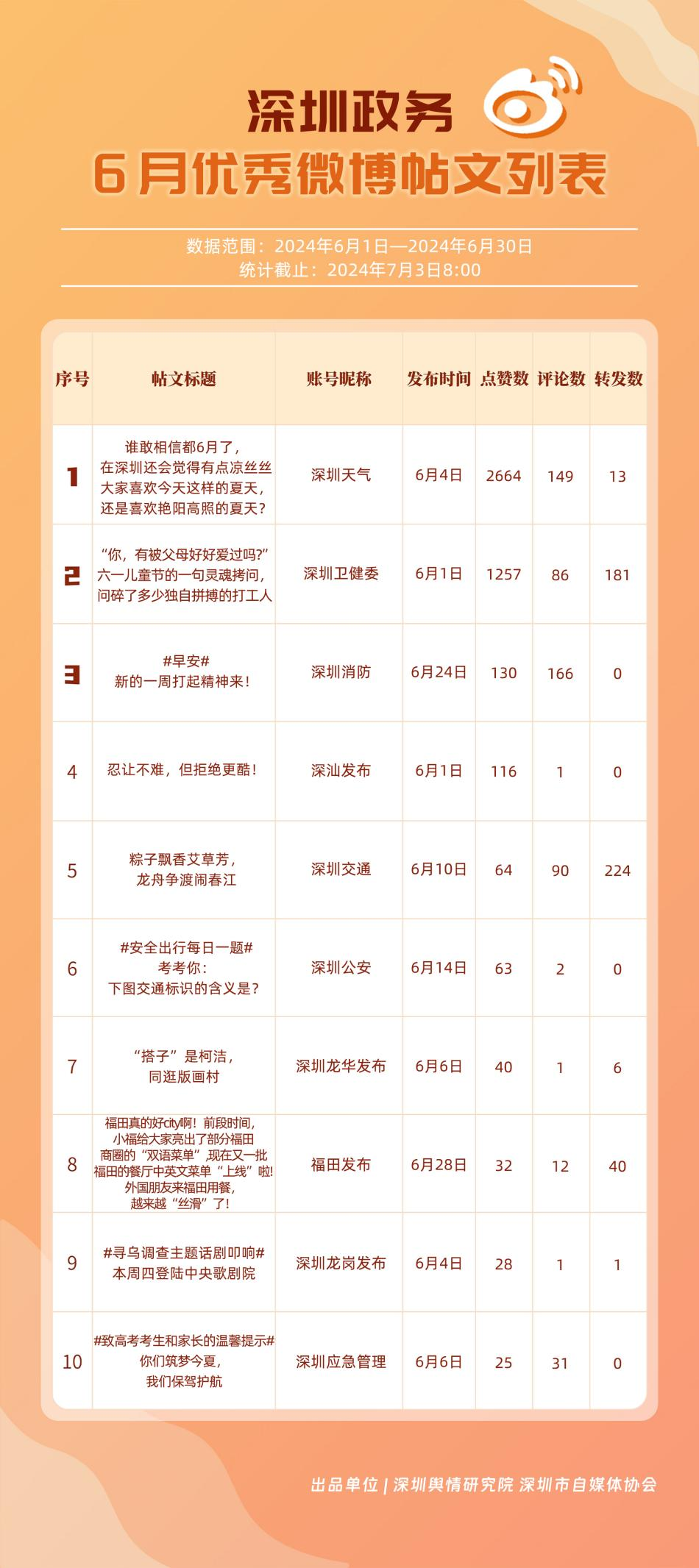 6月,“深圳天氣”“深圳衛(wèi)健委”“深圳消防”“福田發(fā)布”“深圳公安”“深圳應急管理”“深圳交通”“深圳市城市管理和綜合執(zhí)法局”“深圳交警”“深圳龍崗發(fā)布”等20個政務微博號入列“優(yōu)秀”名單?!吧钲谔鞖狻薄吧钲谛l(wèi)健委”“深圳消防”等賬號抓住微博平臺的傳播特征,持續(xù)輸出優(yōu)質(zhì)內(nèi)容,滿足受眾需求,不斷提高用戶體驗和傳播效果。