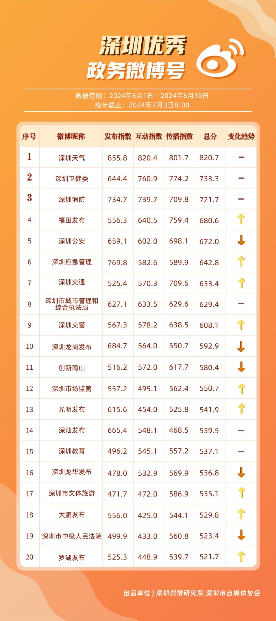 《深圳優(yōu)秀政務新媒體矩陣》將深圳黨政機關、企事業(yè)單位開設的政務公眾號(微信)、微博號、抖音號、視頻號(微信)及頭條號按照發(fā)布指數(shù)、互動指數(shù)、傳播指數(shù)三項指標進行綜合評價,最終形成優(yōu)秀名單。