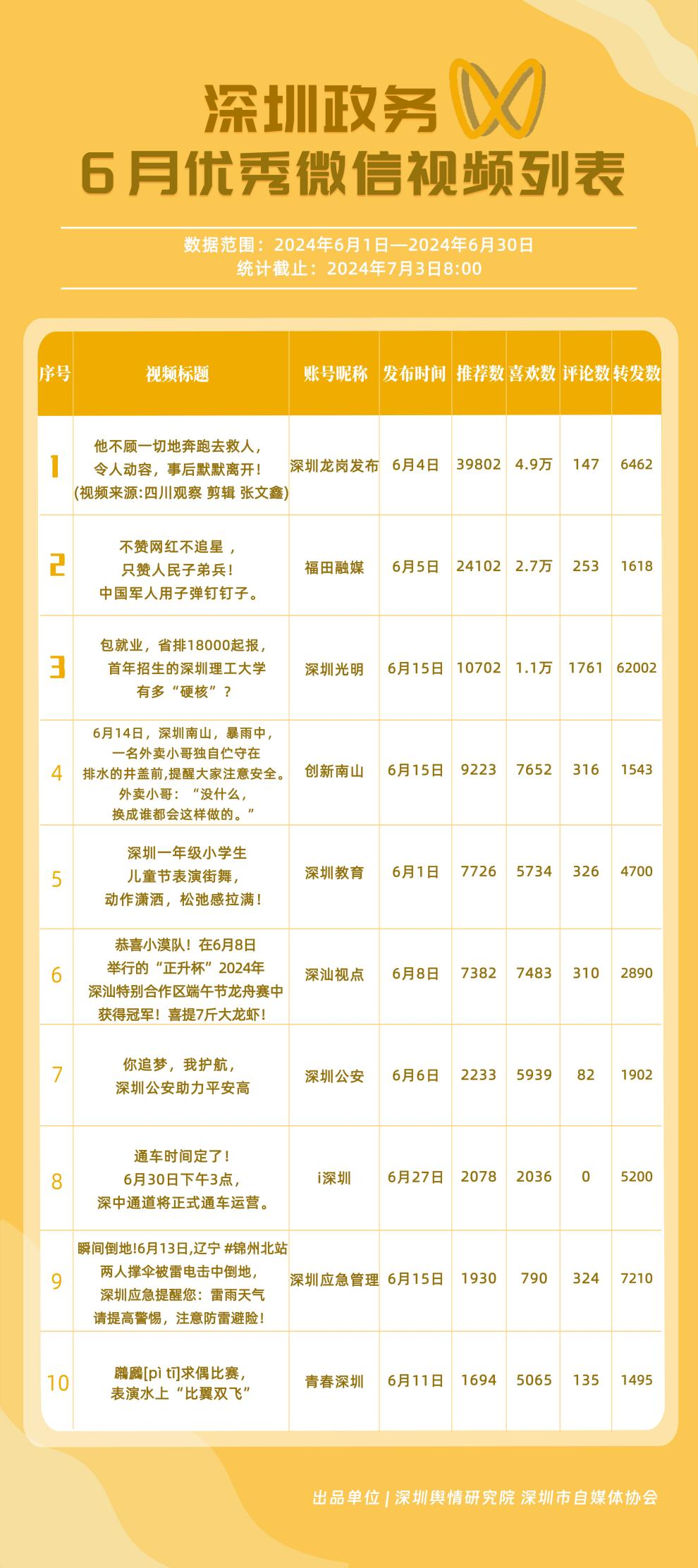6月,政務微信視頻號“深圳光明”“福田融媒”“創(chuàng)新南山”“深圳教育”“深圳龍崗發(fā)布”“深汕觀點”“深圳工會”“深圳公安”“深圳應急管理”和“青春深圳”榮獲“深圳優(yōu)秀政務微信視頻號”稱號。結合整體數(shù)據(jù)來看,6月深圳政務視頻號平臺推出多條爆款視頻,如《他不顧一切地奔跑去救人,令人動容,事后默默離開!》《不贊網(wǎng)紅不追星,只贊人民子弟兵!中國軍人用子彈釘釘子》等作品,收獲了上萬的推薦數(shù)和喜歡數(shù),是政務信息傳播高效化和正能量傳播機制的體現(xiàn)。