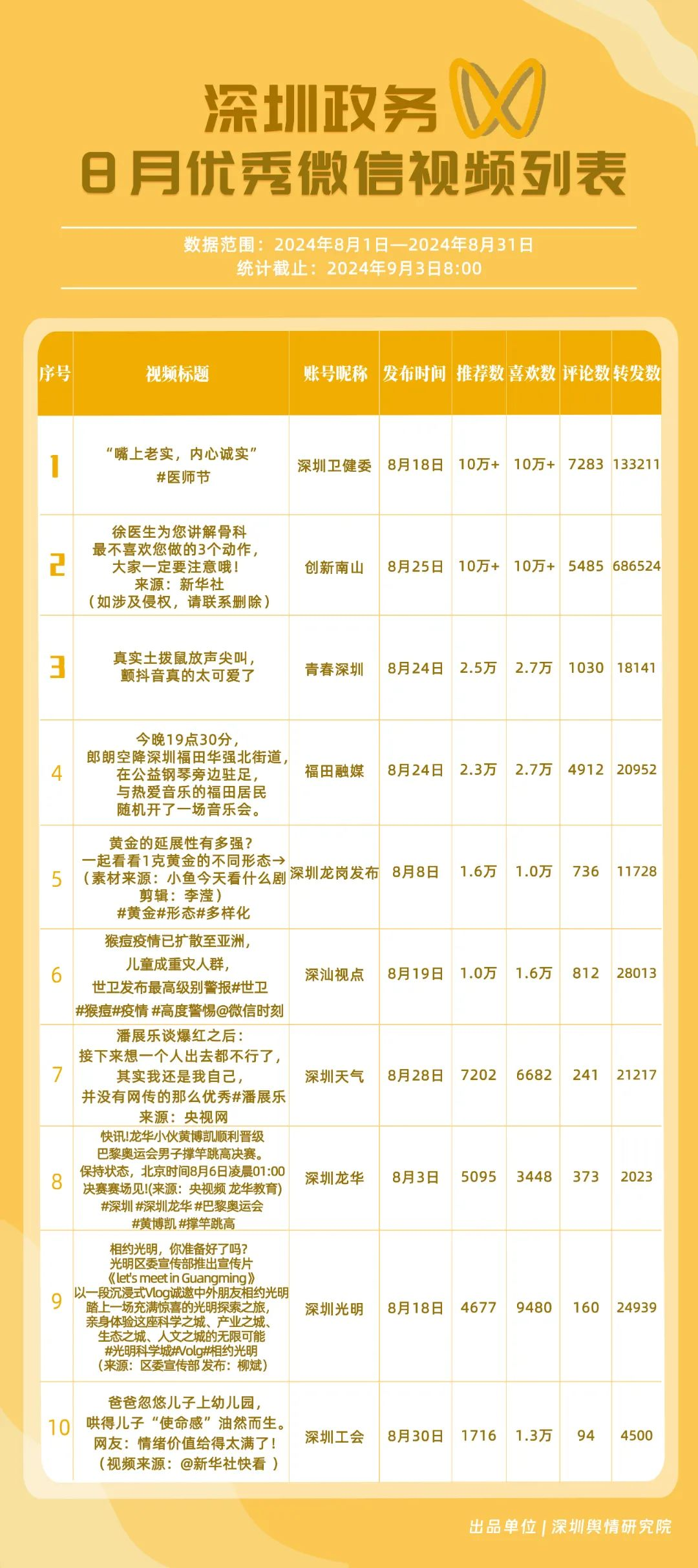 8月,獲“深圳優(yōu)秀政務(wù)微信視頻號”稱號的分別是“創(chuàng)新南山”“深圳衛(wèi)健委”“福田融媒”“深汕視點”“深圳龍崗發(fā)布”“青春深圳”“深圳天氣”“深圳光明”“深圳工會”和“深圳公安”。微信視頻號方面,多賬號以原創(chuàng)內(nèi)容吸引了大量關(guān)注,如“郎朗空降深圳華強北”“深圳坪山長守戲劇谷”等,展示了深圳的文化魅力和城市活力,也有賬號轉(zhuǎn)載網(wǎng)絡(luò)熱門視頻,以其實用性、趣味性獲得了網(wǎng)民的推薦和點贊。