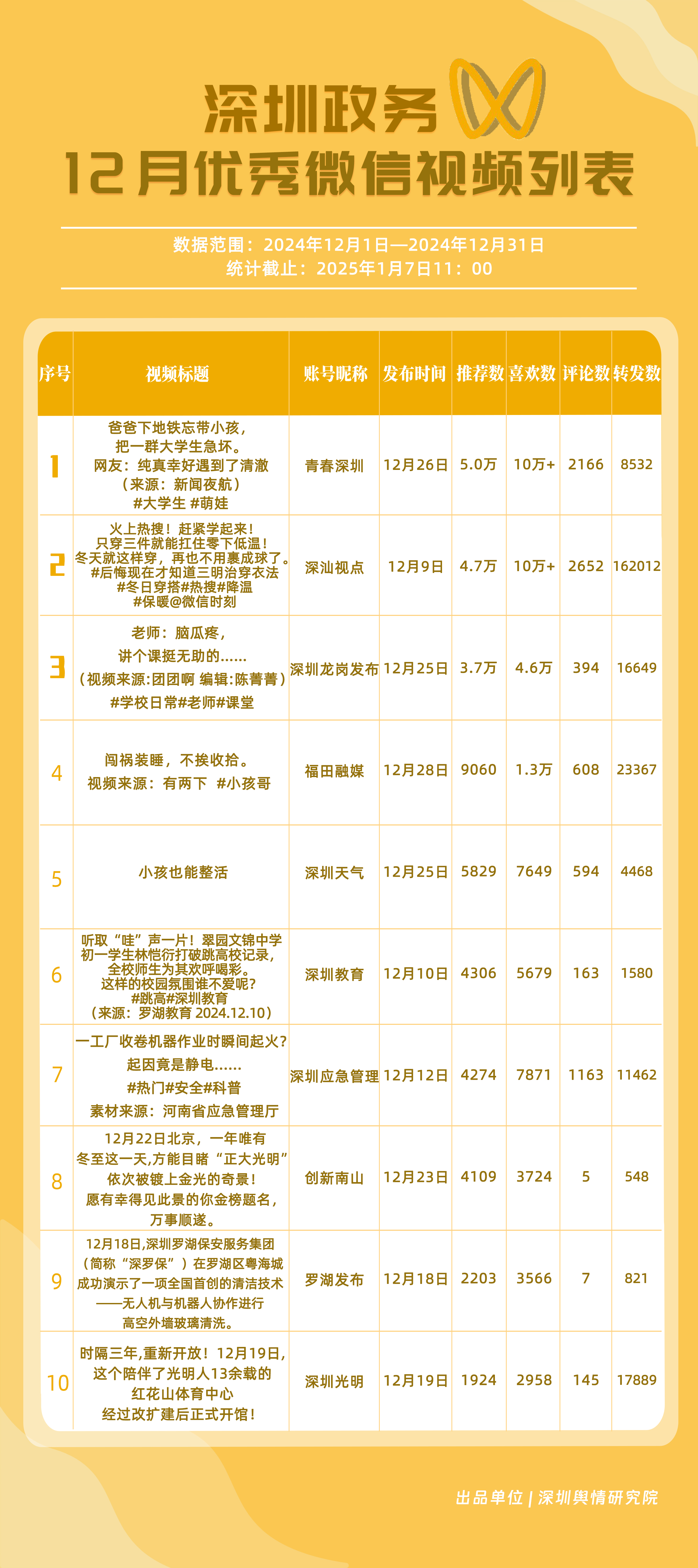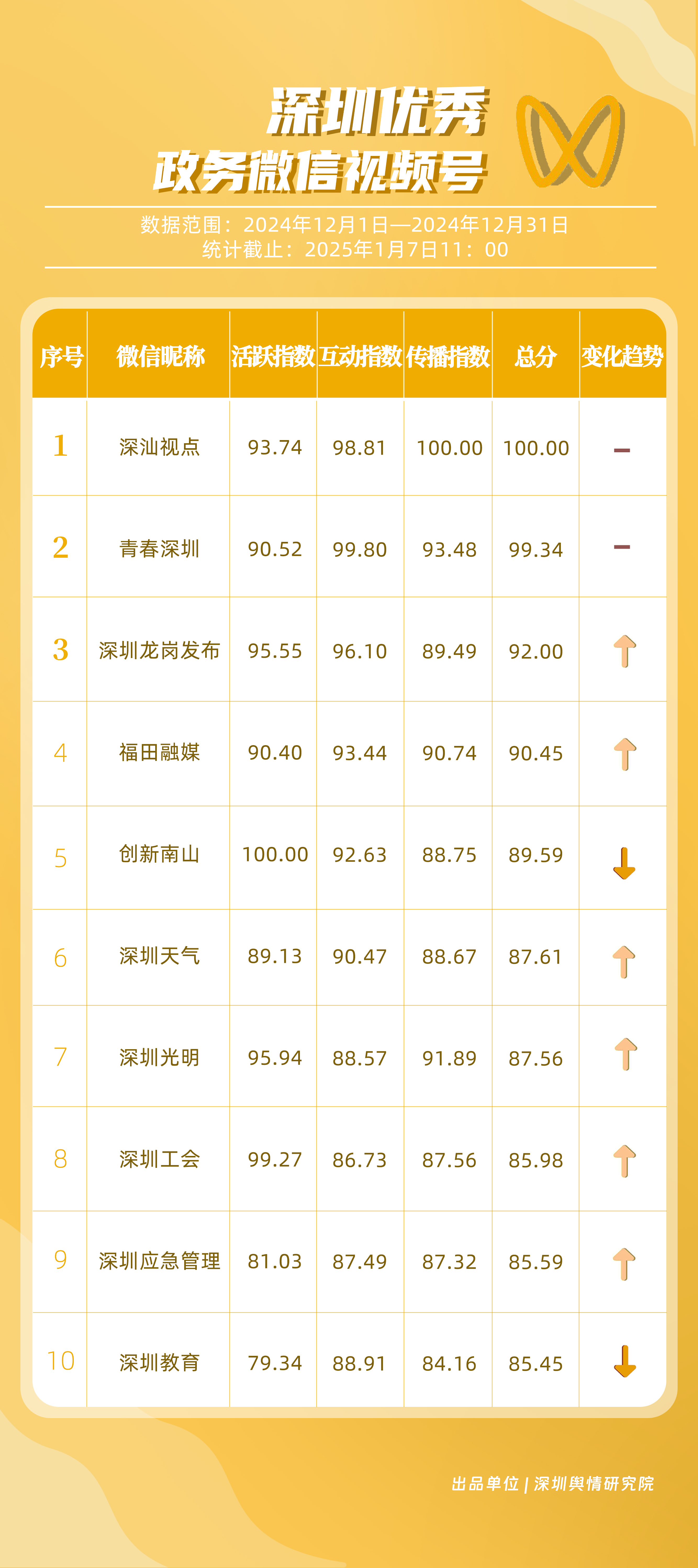 12月,獲“深圳優(yōu)秀政務(wù)微信視頻號(hào)”稱號(hào)的分別是“深汕視點(diǎn)”“青春深圳”“深圳龍崗發(fā)布”“福田融媒”“創(chuàng)新南山”“深圳天氣”“深圳光明”“深圳工會(huì)”“深圳應(yīng)急管理”“深圳教育”。其中,“深汕視點(diǎn)”“青春深圳”在互動(dòng)方面表現(xiàn)突出,占據(jù)榜單第一、第二位置?!吧钲邶垗彴l(fā)布”活躍、互動(dòng)指數(shù)位于各政務(wù)視頻號(hào)前列,排名有所提升。“福田融媒”三大指標(biāo)得分均在90分以上,位于榜單第四名,充分展現(xiàn)各政務(wù)微信視頻號(hào)在信息更新、用戶互動(dòng)以及傳播范圍等方面的卓越能力和持續(xù)進(jìn)步。
