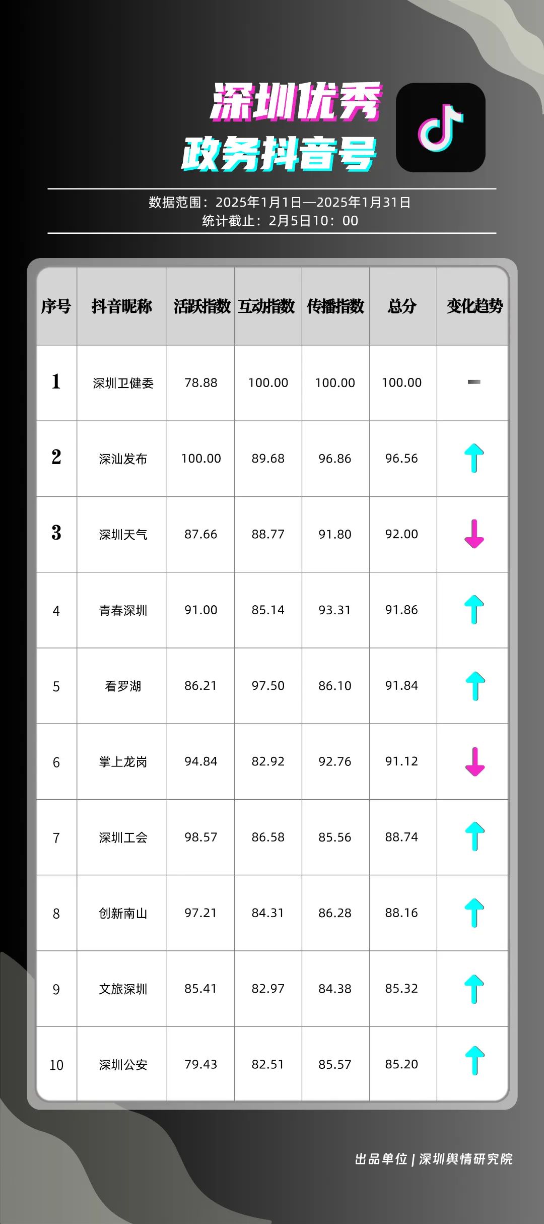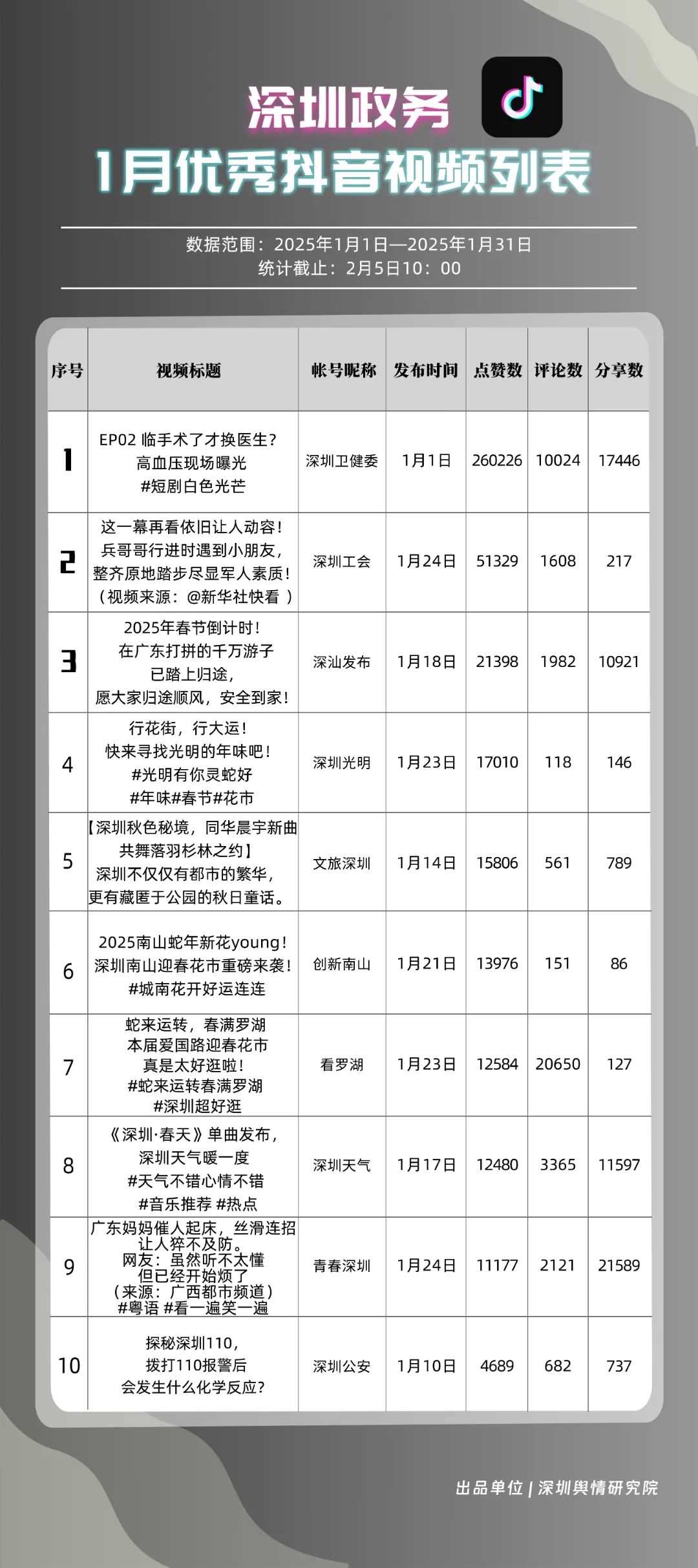 1月,“深圳衛(wèi)健委”“深汕發(fā)布”“深圳天氣”“青春深圳”“看羅湖”“掌上龍崗”“深圳工會”“創(chuàng)新南山”“文旅深圳”“深圳公安”共10個政務(wù)抖音號獲得“深圳優(yōu)秀政務(wù)抖音號”稱號。“深圳衛(wèi)健委”“深汕發(fā)布”“深圳天氣”成績優(yōu)異,綜合實力較強,位于榜單前列?!扒啻荷钲凇薄翱戳_湖”等賬號排名有所提升,彰顯了這些賬號在拓寬受眾基礎(chǔ)、增強用戶黏性等方面所取得的積極成效。