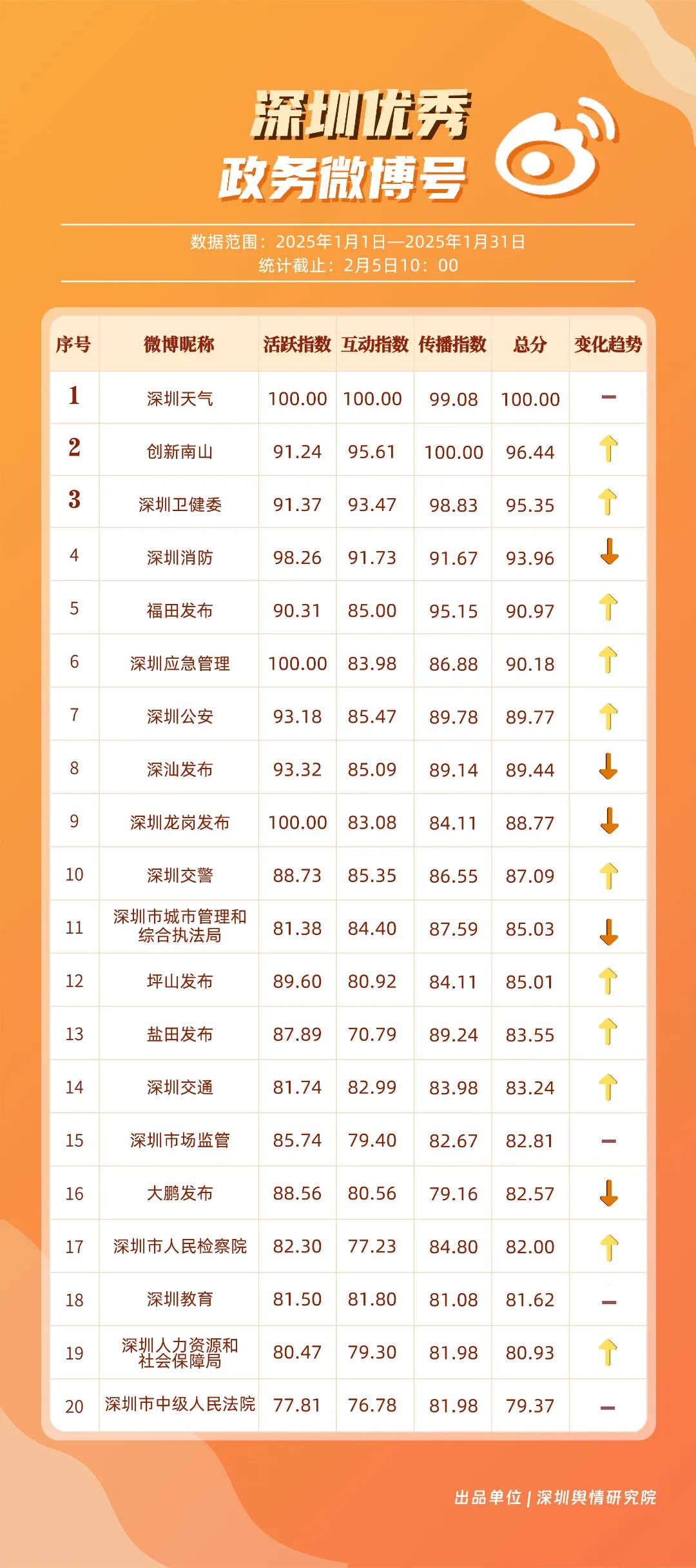1月,“深圳天氣”“創(chuàng)新南山”“深圳衛(wèi)健委”“深圳消防”“福田發(fā)布”“深圳應(yīng)急管理”“深圳公安”“深汕發(fā)布”“深圳龍崗發(fā)布”“深圳交警”等20個賬號入選“優(yōu)秀政務(wù)微博號”?!吧钲谔鞖狻睉{借高活躍度、互動量等獲得滿分,“創(chuàng)新南山”“深圳衛(wèi)健委”賬號則在1月發(fā)力宣傳,排名上升至榜單第二、三位。同時,“深圳消防”“福田發(fā)布”“深圳應(yīng)急管理”賬號總分在90分以上,彰顯了他們在提升公眾安全意識、促進政民互動等方面所做出的積極貢獻。