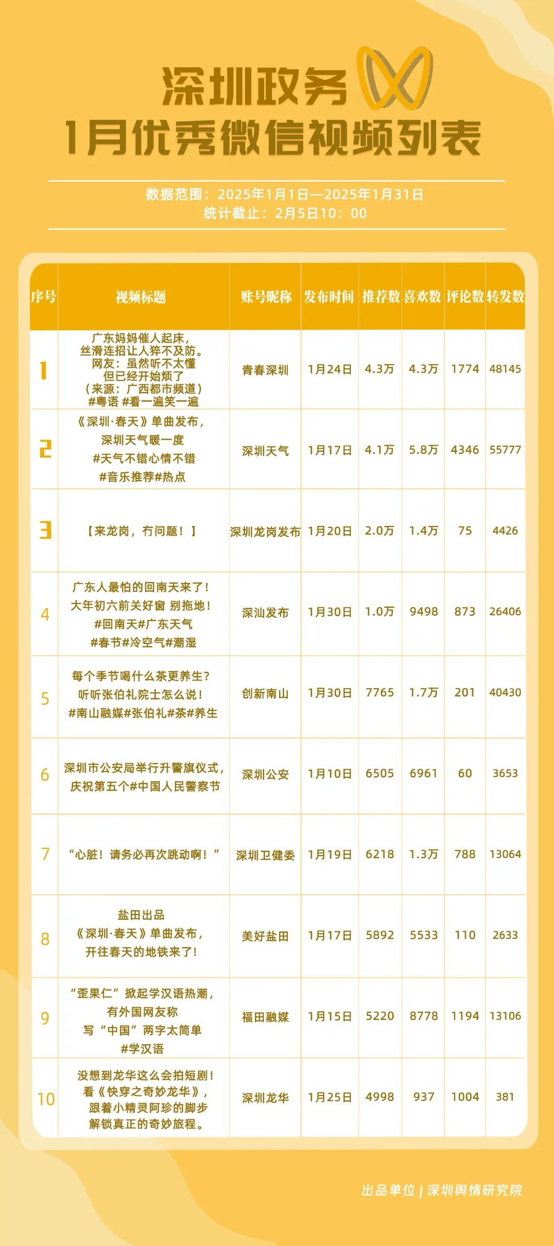 2025年1月期《深圳優(yōu)秀政務(wù)新媒體矩陣》發(fā)布,一同揭曉哪些政務(wù)新媒體矩陣能夠憑借其卓越表現(xiàn)脫穎而出,成為推動政務(wù)信息傳播與服務(wù)模式創(chuàng)新的領(lǐng)航者,引領(lǐng)政務(wù)新媒體運營邁向新高度。
