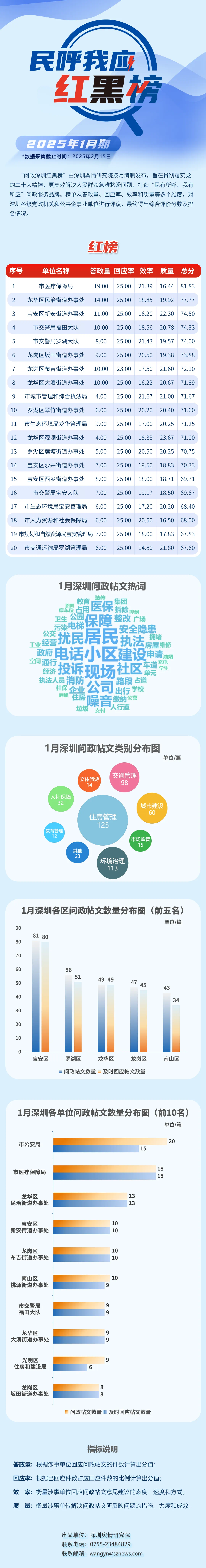 “深圳民呼我應(yīng)紅黑榜”由深圳輿情研究院按月編制發(fā)布,旨在貫徹落實黨的二十大精神,更高效解決人民群眾急難愁盼問題,打造“民有所呼、我有所應(yīng)”問政服務(wù)品牌。榜單從答政量、回應(yīng)率、效率和質(zhì)量等多個維度對深圳各級黨政機關(guān)和公共企事業(yè)單位進行評議,最終得出綜合評價分數(shù)及排名情況。