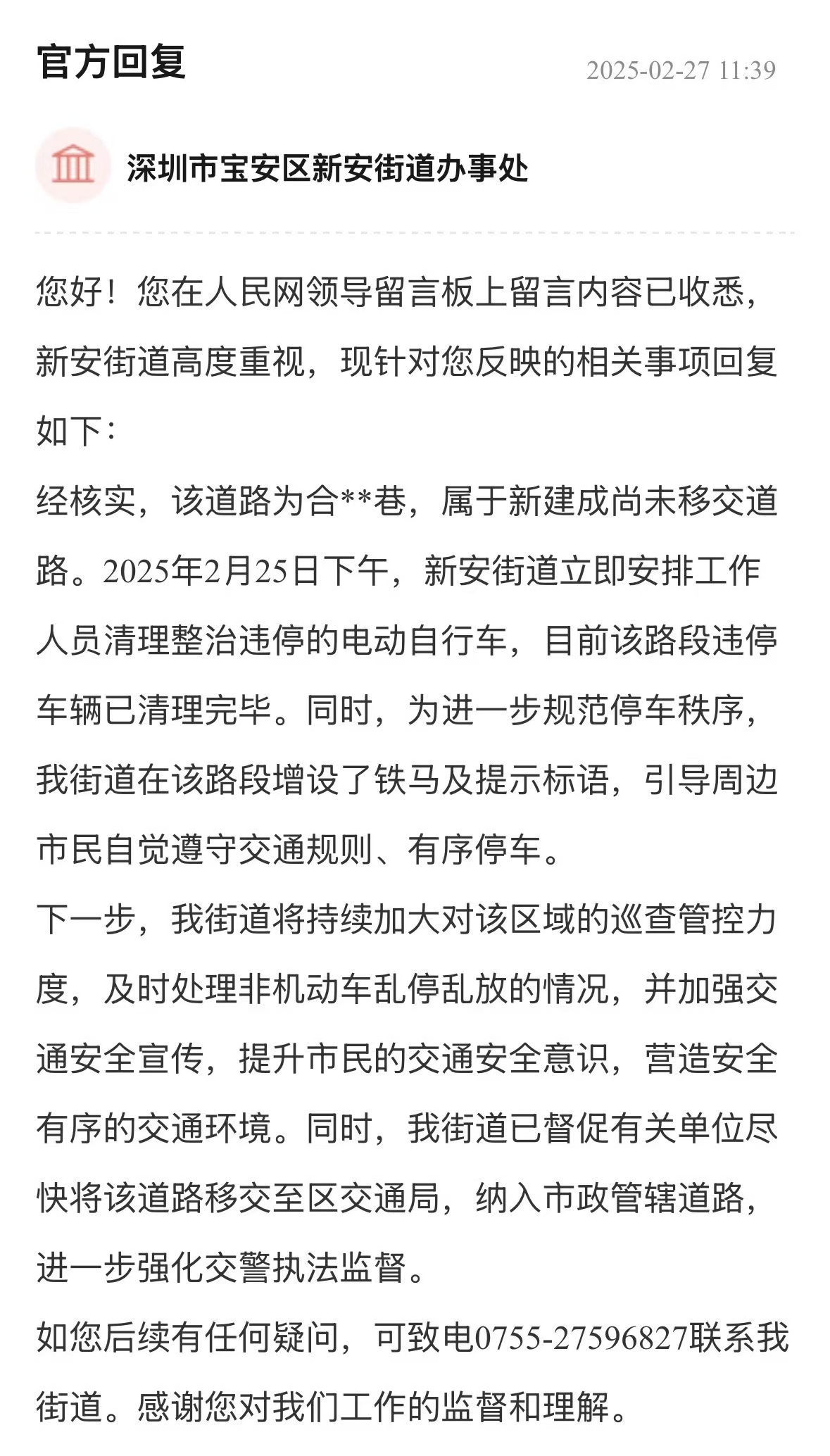 案例點(diǎn)評(píng):非機(jī)動(dòng)車(chē)亂停放影響交通和消防安全,嚴(yán)重影響市民生活。街道辦行動(dòng)迅速,第一時(shí)間清理違停車(chē)輛,增設(shè)鐵馬及提示標(biāo)語(yǔ),規(guī)范停車(chē)秩序,展現(xiàn)了高效的處置能力。回應(yīng)中,街道還制定了長(zhǎng)效治理計(jì)劃,構(gòu)建“短期整治+長(zhǎng)效管理”模式,有助于解決區(qū)域交通問(wèn)題,提升城市管理水平。