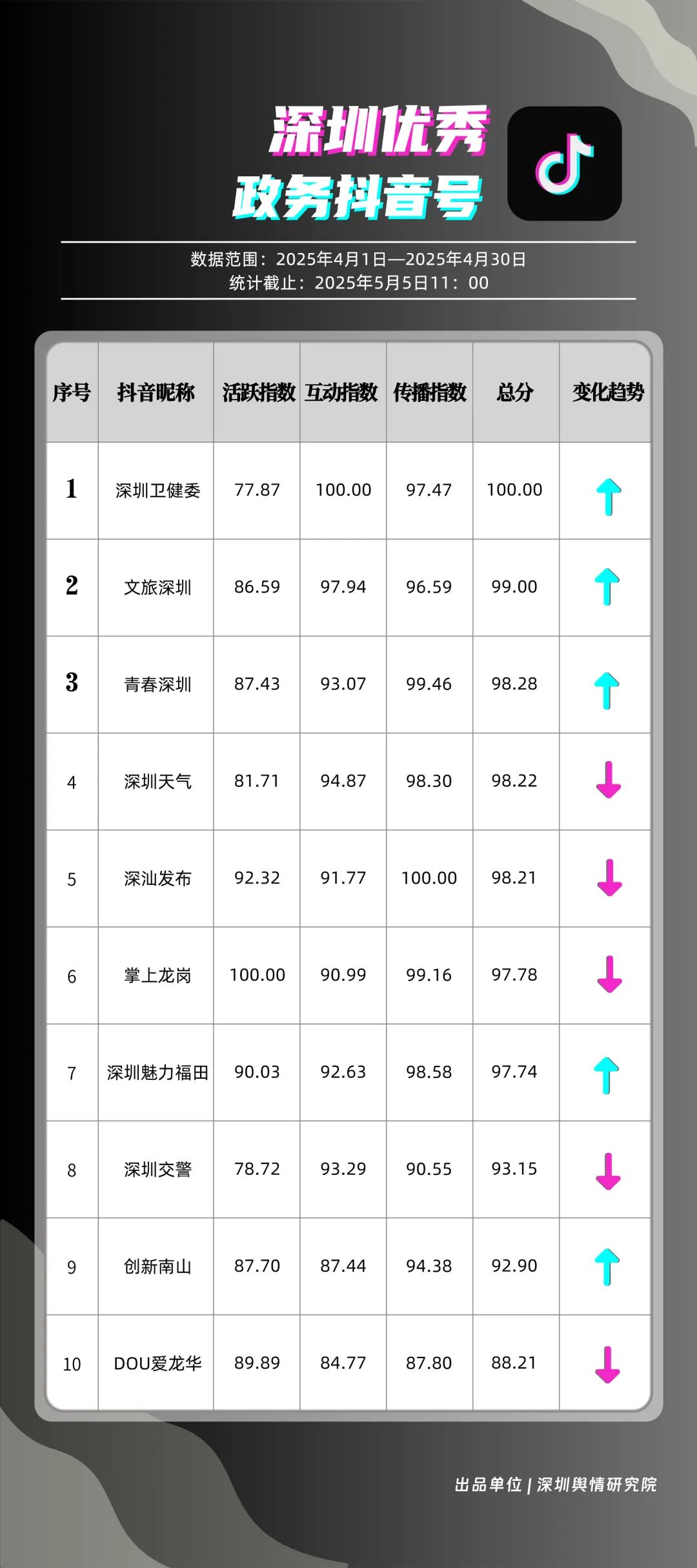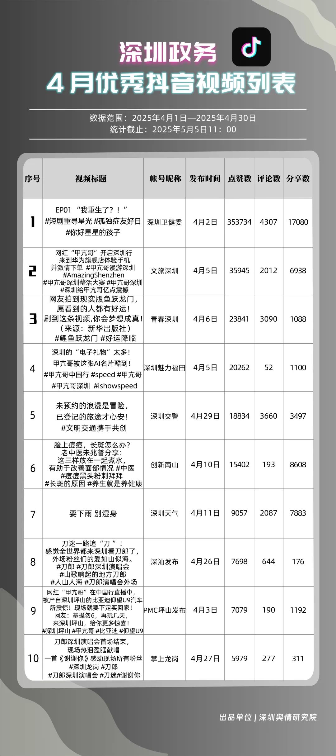 4月,“深圳衛(wèi)健委”“文旅深圳”“青春深圳”“深圳天氣”“深汕發(fā)布”“掌上龍崗”“深圳魅力福田”“深圳交警”“創(chuàng)新南山”“DOU愛(ài)龍華”共10個(gè)政務(wù)抖音號(hào)獲得“優(yōu)秀政務(wù)抖音號(hào)”稱號(hào)。4月,“深圳衛(wèi)健委”“文旅深圳”“青春深圳”憑借新穎的內(nèi)容策劃、生動(dòng)的短視頻呈現(xiàn)方式,實(shí)現(xiàn)排名提升,位居榜單前三。“深圳天氣”“深汕發(fā)布”緊隨其后,以優(yōu)質(zhì)實(shí)用的內(nèi)容、接地氣的表達(dá),持續(xù)擴(kuò)大政務(wù)新媒體的傳播聲量。上榜賬號(hào)積極探索創(chuàng)新傳播路徑,以生動(dòng)有趣的方式傳遞政務(wù)信息,為深圳政務(wù)新媒體在短視頻領(lǐng)域的發(fā)展注入新活力。