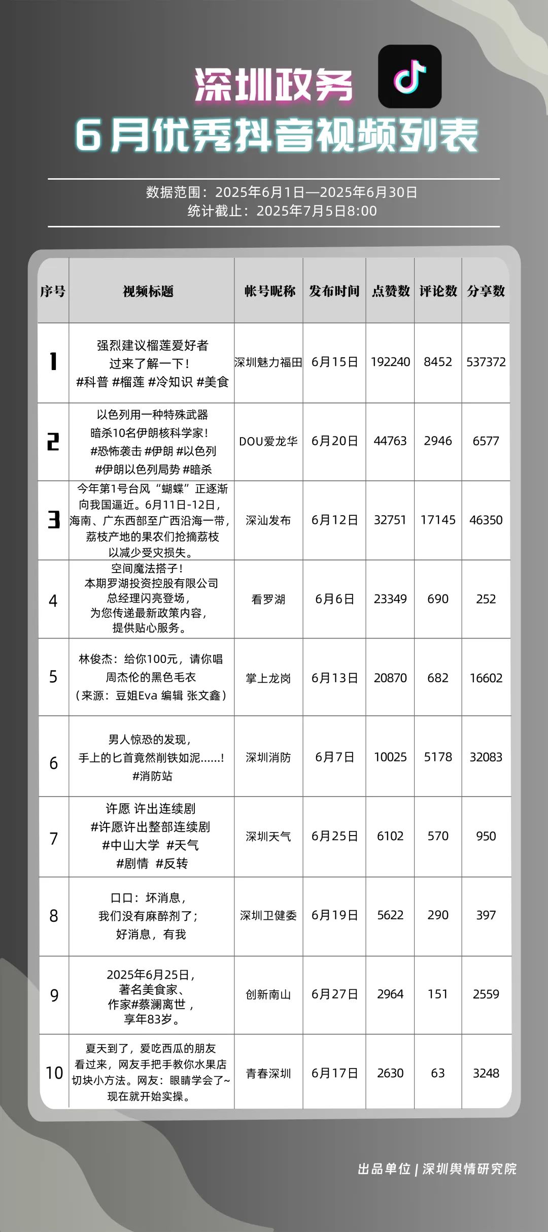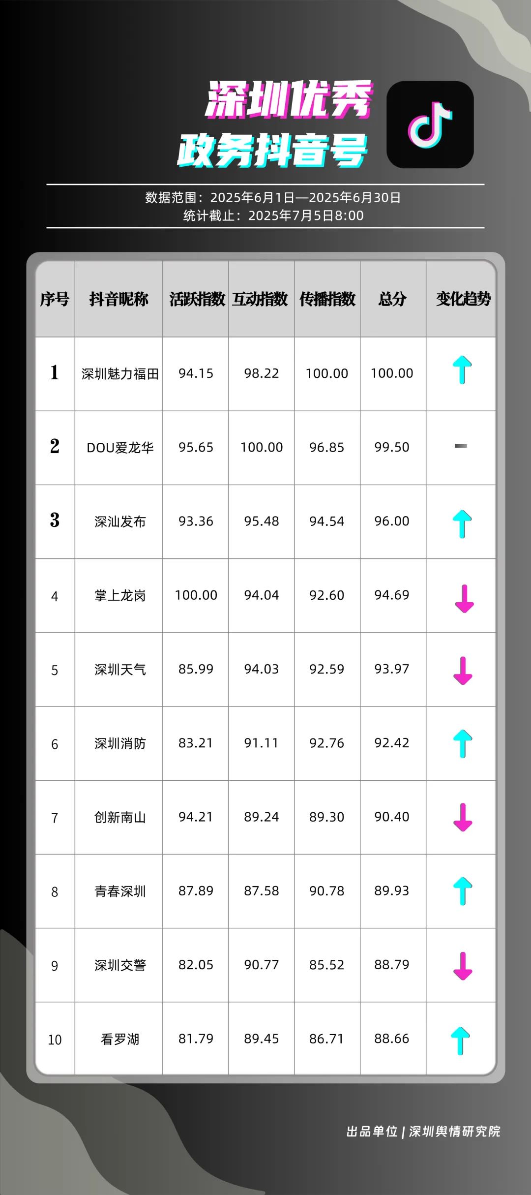 6月,“深圳魅力福田”“DOU愛龍華”“深汕發(fā)布”“掌上龍崗”“深圳天氣”“深圳消防”“創(chuàng)新南山”“青春深圳”“深圳交警”“看羅湖”共10個政務(wù)抖音號獲得“優(yōu)秀政務(wù)抖音號”稱號。6月,“深圳魅力福田”登頂,憑借其城市人文、社會熱點類主題短視頻,在傳播指數(shù)得分創(chuàng)新高;“DOU愛龍華”“深汕發(fā)布”“掌上龍崗”緊隨其后,通過各類熱點、創(chuàng)意內(nèi)容提升傳播效能?!吧钲谔鞖狻薄吧钲谙馈币脖憩F(xiàn)突出,短視頻內(nèi)容兼具“信息傳遞”與“情感共鳴”,用戶參與度持續(xù)提升,不斷為網(wǎng)民傳播有價值的政務(wù)信息資訊。