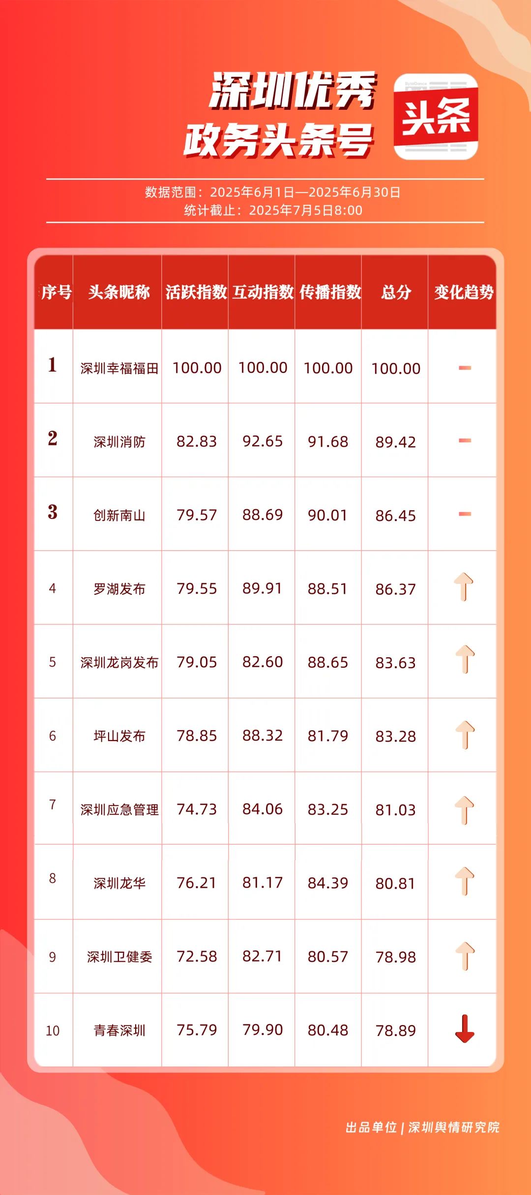 6月,“深圳幸福福田”“深圳消防”“創(chuàng)新南山”“羅湖發(fā)布”“深圳龍崗發(fā)布”“坪山發(fā)布”“深圳應(yīng)急管理”“深圳龍華”“深圳衛(wèi)健委”“青春深圳”共10個政務(wù)頭條號入選“優(yōu)秀政務(wù)頭條號”榜單。“深圳幸福福田”“深圳消防”“創(chuàng)新南山”連續(xù)位居榜單前3名,內(nèi)容具備較強的吸引力?!傲_湖發(fā)布”“深圳龍崗發(fā)布”排名也在榜單前列,排名較5月有所上升,在區(qū)域形象宣傳與民生服務(wù)中持續(xù)發(fā)力。