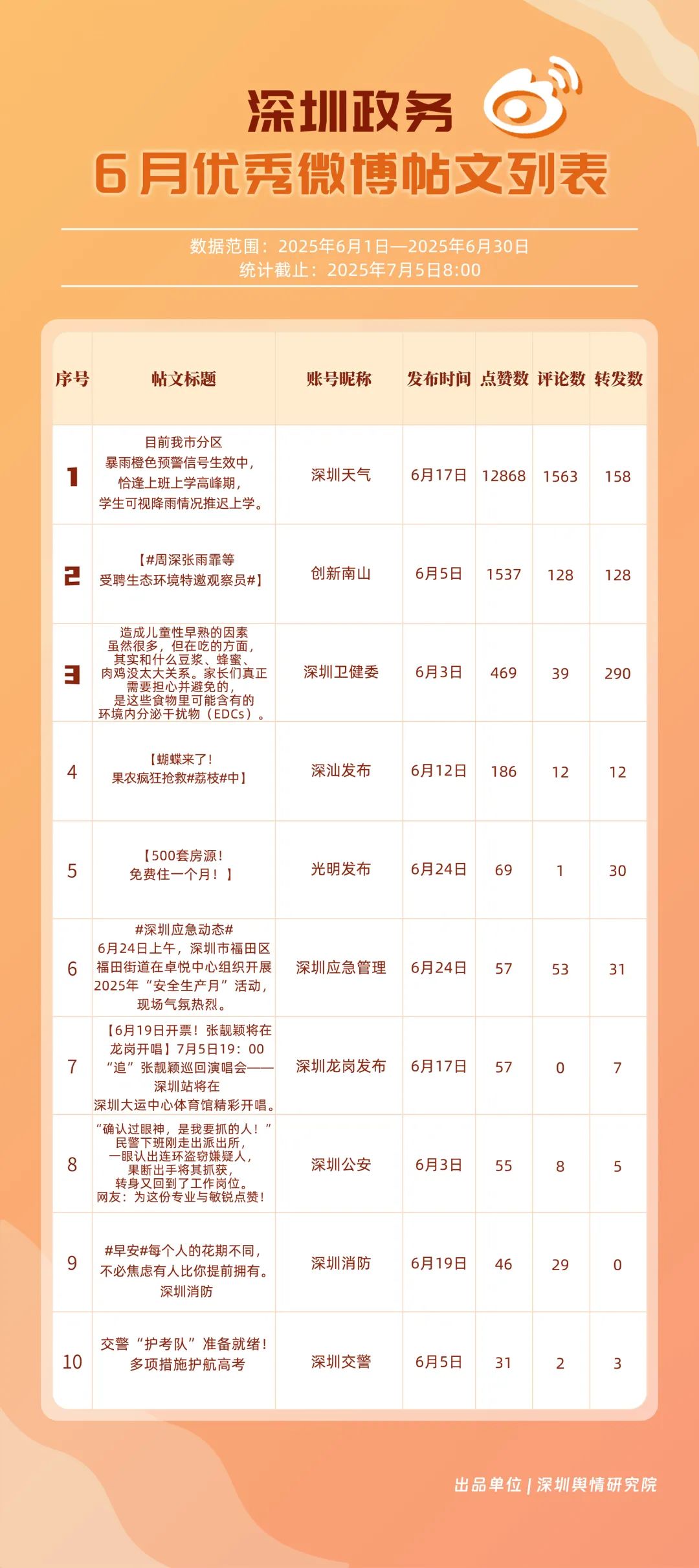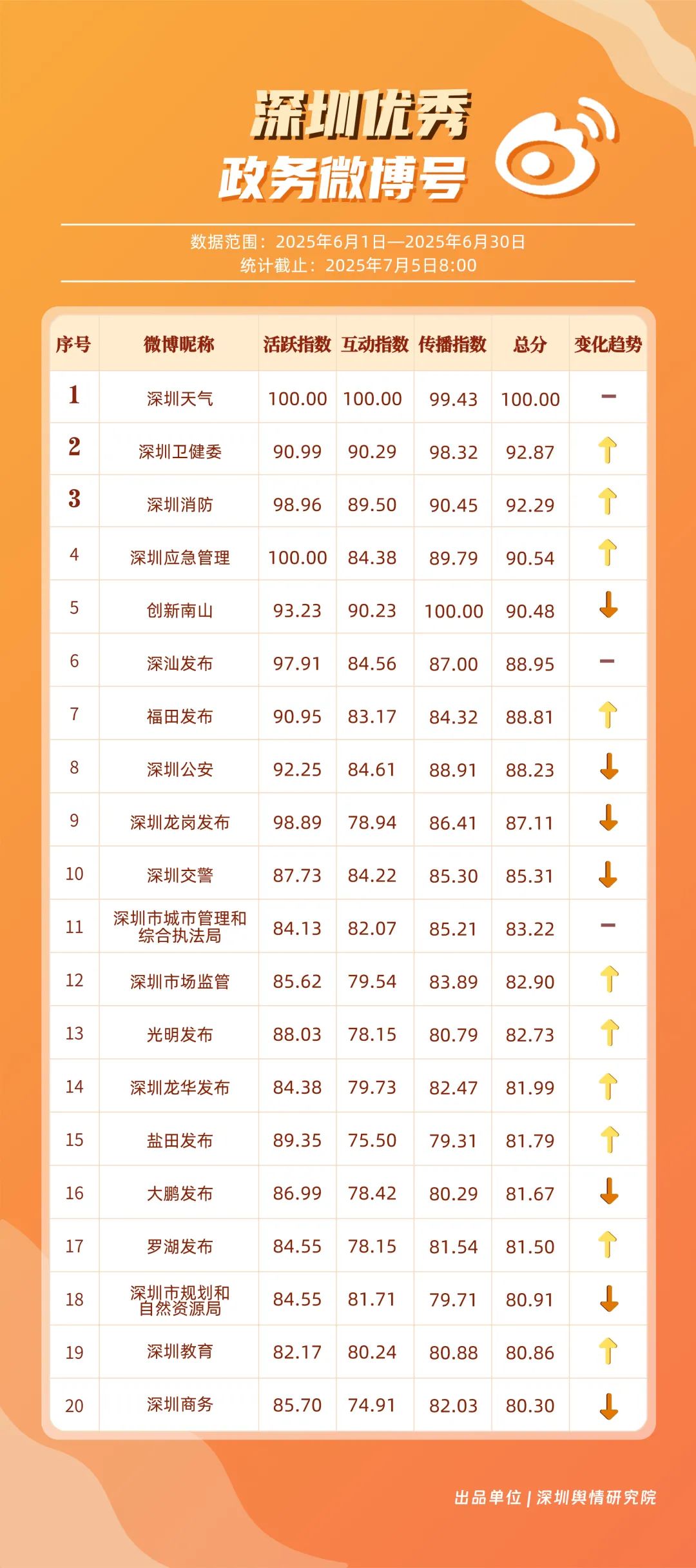 6月,“深圳天氣”“深圳衛(wèi)健委”“深圳消防”“深圳應(yīng)急管理”“創(chuàng)新南山”“深汕發(fā)布”“福田發(fā)布”“深圳公安”“深圳龍崗發(fā)布”“深圳交警”等20個賬號入選“優(yōu)秀政務(wù)微博號”。其中,“深圳天氣”以活躍、互動指數(shù)雙滿分穩(wěn)居第一,氣象服務(wù)信息及時性與科普內(nèi)容趣味性獲市民高度認(rèn)可;“深圳衛(wèi)健委”“深圳消防”“深圳應(yīng)急管理”分別位列2至4位,通過熱點話題聯(lián)動醫(yī)療、消防、應(yīng)急知識科普擴大影響力,政務(wù)微博矩陣在突發(fā)事件響應(yīng)與民生服務(wù)中作用凸顯。