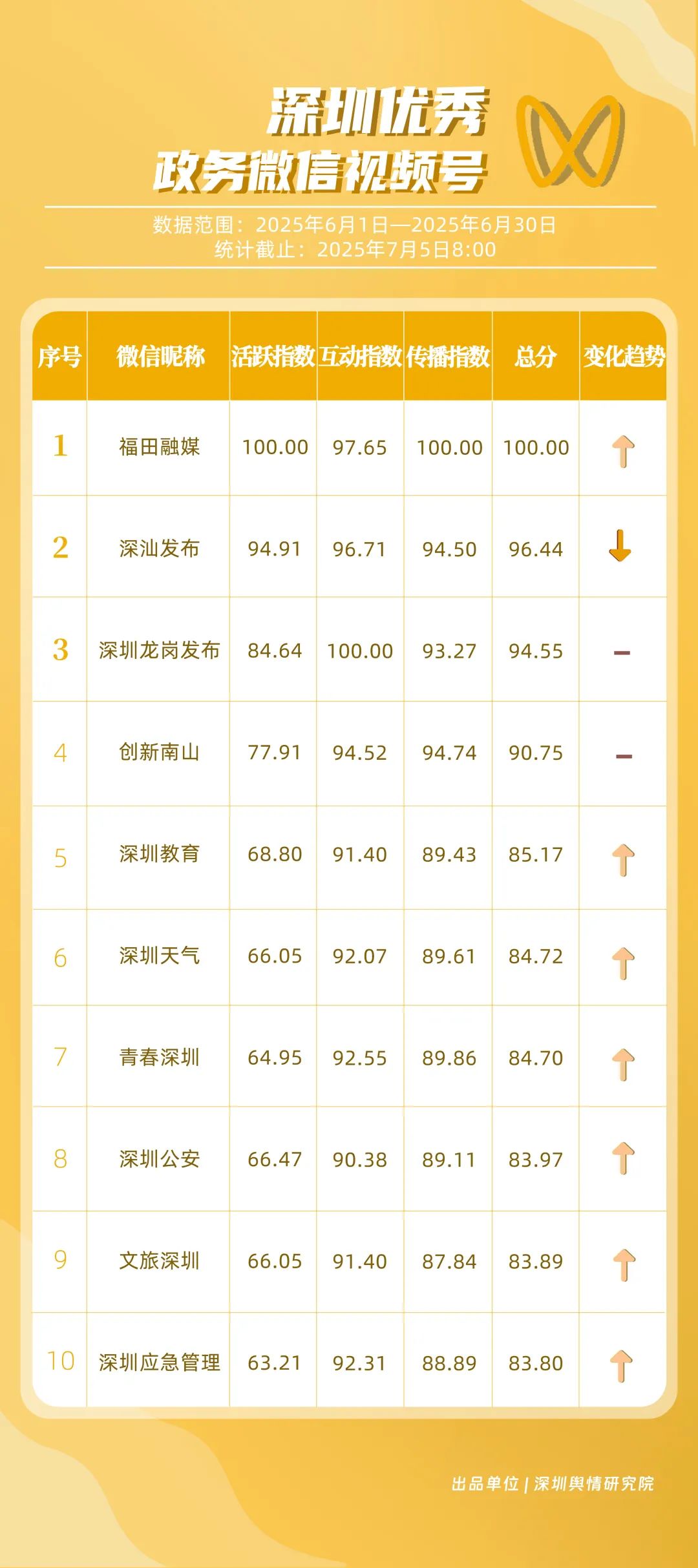 6月,獲得“深圳優(yōu)秀政務(wù)微信視頻號”稱號的是“福田融媒”“深汕發(fā)布”“深圳龍崗發(fā)布”“創(chuàng)新南山”“深圳教育”“深圳天氣”“青春深圳”“深圳公安”“文旅深圳”“深圳應(yīng)急管理”。其中,“福田融媒”以活躍、傳播指數(shù)雙滿分居榜首,其視頻《吃大量荔枝后中毒 警惕“荔枝病”重者可致死》獲得超36萬次轉(zhuǎn)發(fā),成為爆款案例;“深汕發(fā)布”“深圳龍崗發(fā)布”“創(chuàng)新南山”得分在90分以上,在互動、傳播方面表現(xiàn)亮眼。這些優(yōu)秀的政務(wù)微信視頻號以各自的獨特風(fēng)格持續(xù)發(fā)力,為政務(wù)及民生信息傳遞開拓更鮮活、暢通的路徑。