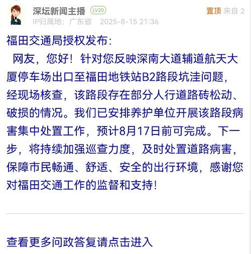 網友,您好!針對您反映深南大道輔道航天大廈停車場出口至福田地鐵站B2路段坑洼問題,經現場核查,該路段存在部分人行道路磚松動、破損的情況。我們已安排養(yǎng)護單位開展該路段病害集中處置工作,預計8月17日前可完成。下一步,將持續(xù)加強巡查力度,及時處置道路病害,保障市民暢通、舒適、安全的出行環(huán)境,感謝您對福田交通工作的監(jiān)督和支持!