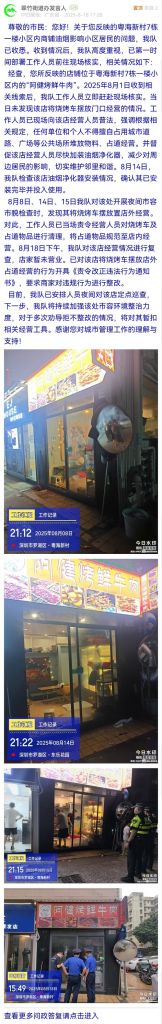 經查,您所反映的店鋪位于粵海新村7棟一樓小區(qū)內的“阿健烤鮮牛肉”。2025年8月1日收到相關線索后,我隊工作人員立即趕赴現場核實。當日未發(fā)現該店將燒烤車擺放門口經營的情況。工作人員已現場向該店經營人員普法,強調根據相關規(guī)定,任何單位和個人不得擅自占用城市道路、廣場等公共場所堆放物料、占道經營。并督促該店經營人員盡快加裝油煙凈化器,減少對周邊居民的影響,切實維護鄰里和諧。8月14日,我隊檢查該店油煙凈化器安裝情況,確認其已安裝完畢并投入使用。
