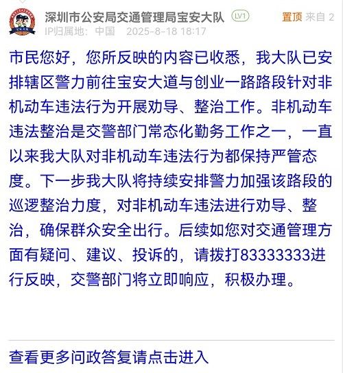 市民您好,您所反映的內容已收悉,我大隊已安排轄區(qū)警力前往寶安大道與創(chuàng)業(yè)一路路段針對非機動車違法行為開展勸導、整治工作。非機動車違法整治是交警部門常態(tài)化勤務工作之一,一直以來我大隊對非機動車違法行為都保持嚴管態(tài)度。下一步我大隊將持續(xù)安排警力加強該路段的巡邏整治力度,對非機動車違法進行勸導、整治,確保群眾安全出行。后續(xù)如您對交通管理方面有疑問、建議、投訴的,請撥打83333333進行反映,交警部門將立即響應,積極辦理。