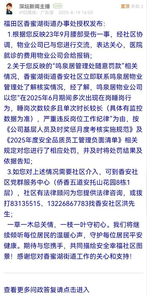 2.關于您反映的“鳴泉居管理處隨意罰款”相關情況,香蜜湖街道香安社區(qū)立即聯系鳴泉居物業(yè)管理處了解核實情況,經了解,鳴泉居物業(yè)公司以您“在2025年6月期間多次出現在崗睡崗行為,睡崗次數較多且單次時長較長(具體有監(jiān)控數據為準),嚴重違反崗位工作紀律”為由,按《公司基層人員及時獎懲月度考核實施規(guī)范》及《2025年度安全品質員工管理負面清單》相關規(guī)定對您進行了相應處罰,并及時將處罰結果及依據告知;