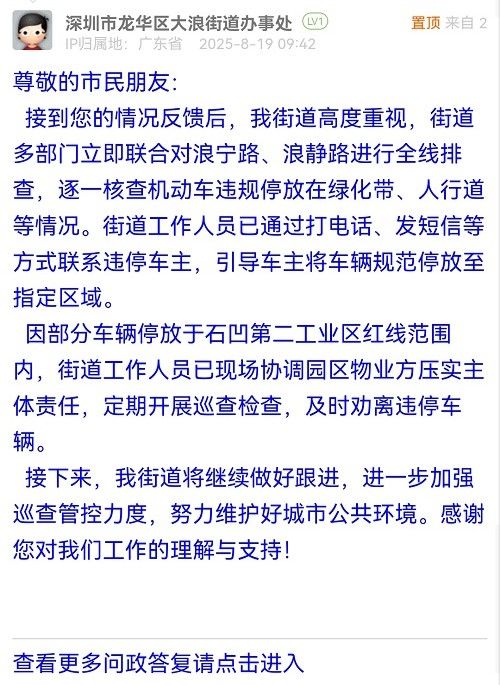 接到您的情況反饋后,我街道高度重視,街道多部門立即聯合對浪寧路、浪靜路進行全線排查,逐一核查機動車違規(guī)停放在綠化帶、人行道等情況。街道工作人員已通過打電話、發(fā)短信等方式聯系違停車主,引導車主將車輛規(guī)范停放至指定區(qū)域。
