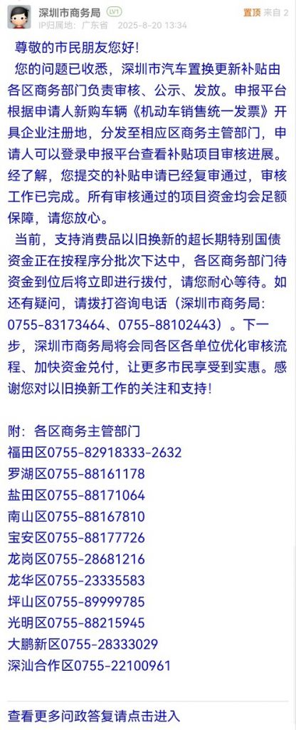 您的問題已收悉,深圳市汽車置換更新補貼由各區(qū)商務部門負責審核、公示、發(fā)放。申報平臺根據申請人新購車輛《機動車銷售統(tǒng)一發(fā)票》開具企業(yè)注冊地,分發(fā)至相應區(qū)商務主管部門,申請人可以登錄申報平臺查看補貼項目審核進展。經了解,您提交的補貼申請已經復審通過,審核工作已完成。所有審核通過的項目資金均會足額保障,請您放心。