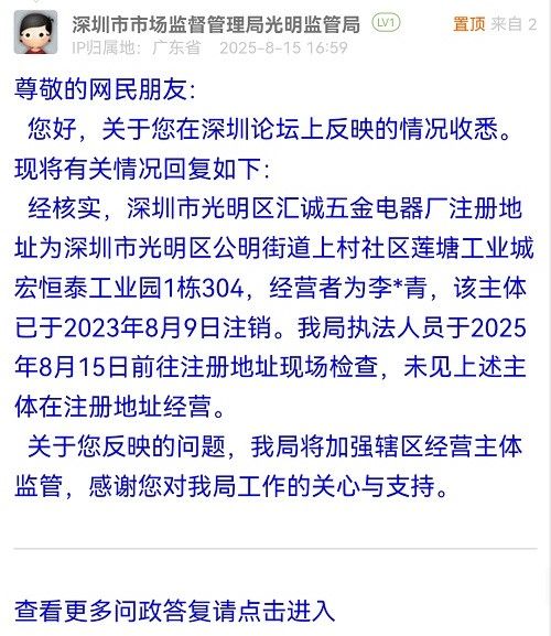 尊敬的網民朋友:您好,關于您在深圳論壇上反映的情況收悉?,F將有關情況回復如下:經核實,深圳市光明區(qū)匯誠五金電器廠注冊地址為深圳市光明區(qū)公明街道上村社區(qū)蓮塘工業(yè)城宏恒泰工業(yè)園1棟304,經營者為李*青,該主體已于2023年8月9日注銷。我局執(zhí)法人員于2025年8月15日前往注冊地址現場檢查,未見上述主體在注冊地址經營。關于您反映的問題,我局將加強轄區(qū)經營主體監(jiān)管,感謝您對我局工作的關心與支持。