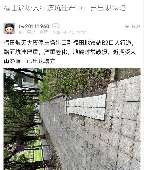19. 帖文《福田這處人行道坑洼嚴重,已出現塌陷》
