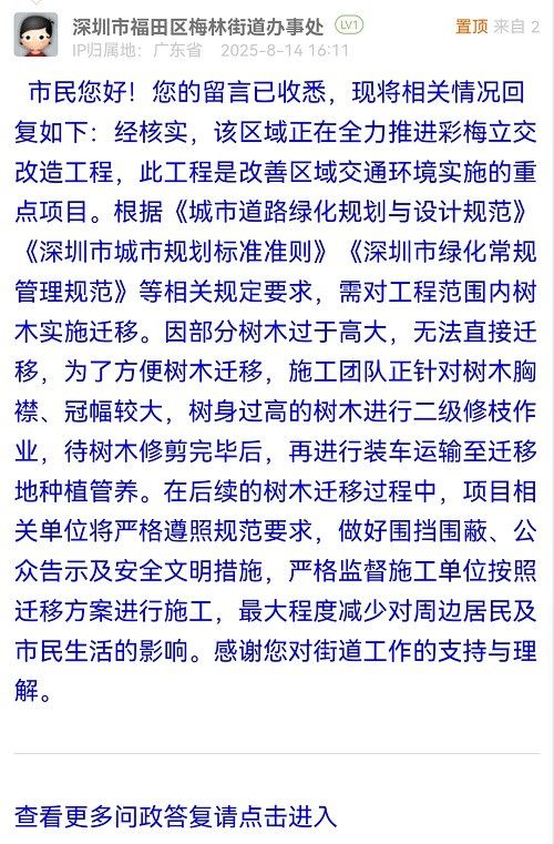 市民您好!您的留言已收悉,現將相關情況回復如下:經核實,該區(qū)域正在全力推進彩梅立交改造工程,此工程是改善區(qū)域交通環(huán)境實施的重點項目。根據《城市道路綠化規(guī)劃與設計規(guī)范》《深圳市城市規(guī)劃標準準則》《深圳市綠化常規(guī)管理規(guī)范》等相關規(guī)定要求,需對工程范圍內樹木實施遷移。因部分樹木過于高大,無法直接遷移,為了方便樹木遷移,施工團隊正針對樹木胸襟、冠幅較大,樹身過高的樹木進行二級修枝作業(yè),待樹木修剪完畢后,再進行裝車運輸至遷移地種植管養(yǎng)。在后續(xù)的樹木遷移過程中,項目相關單位將嚴格遵照規(guī)范要求,做好圍擋圍蔽、公眾告示及安全文明措施,嚴格監(jiān)督施工單位按照遷移方案進行施工,最大程度減少對周邊居民及市民生活的影響。感謝您對街道工作的支持與理解。