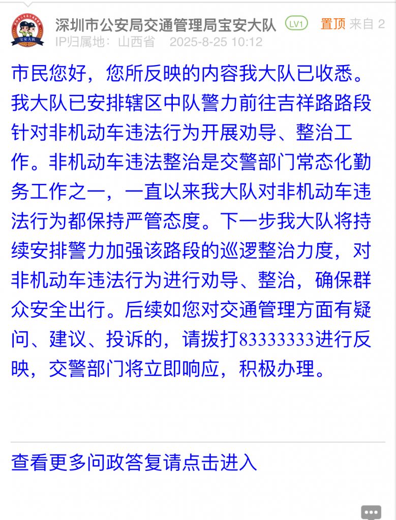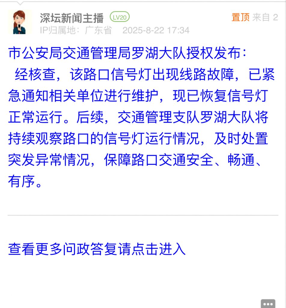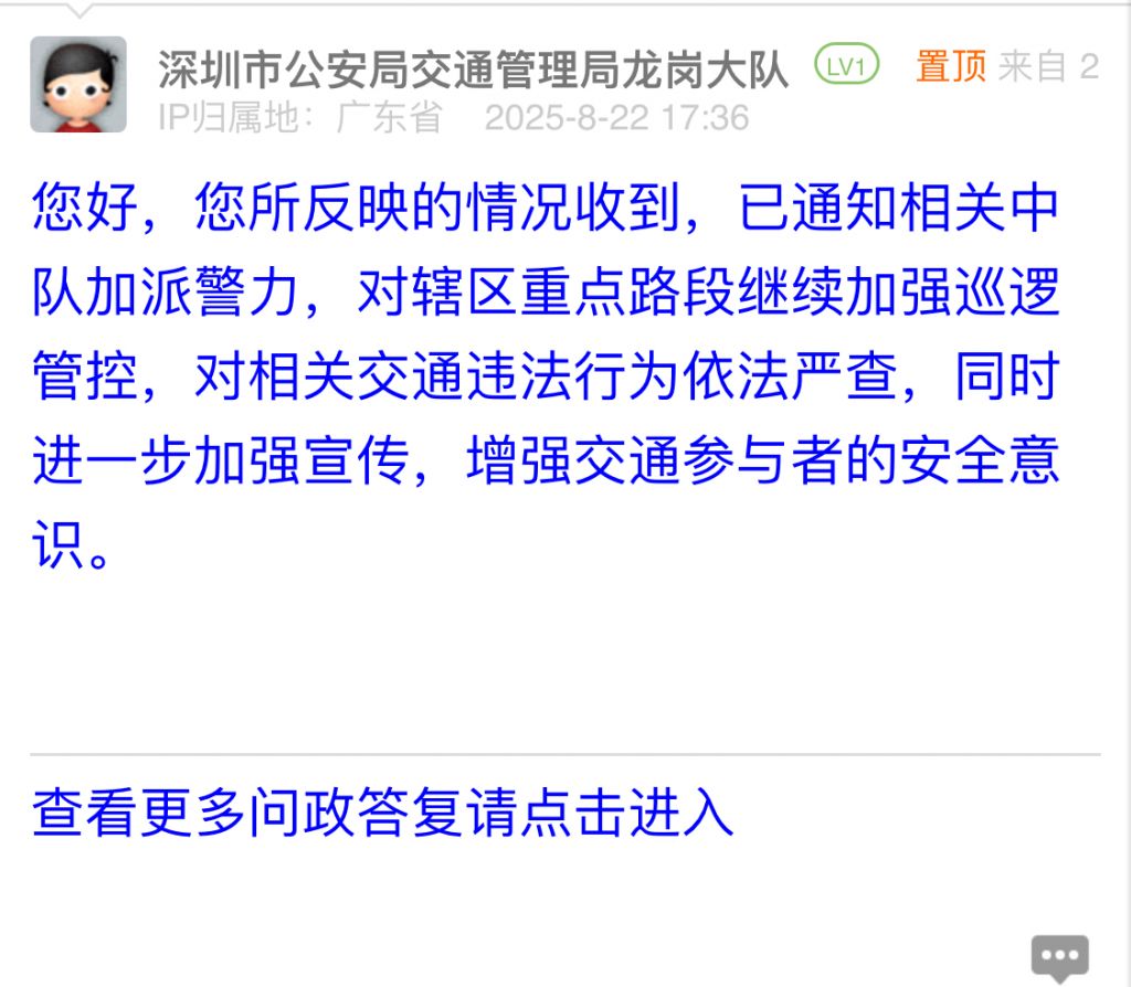 據(jù)統(tǒng)計(jì),2025年8月18日-2025年8月24日,網(wǎng)友在深圳論壇發(fā)布問政類帖文共40篇,得到相關(guān)單位正式回應(yīng)的帖文數(shù)為40篇,本期簡報(bào)回應(yīng)速度最快的單位:市公安局交通管理局寶安大隊(duì)、市公安局交通管理局羅湖大隊(duì)、羅湖區(qū)翠竹街道辦事處、市生態(tài)環(huán)境局寶安管理局、龍崗區(qū)城市管理和綜合執(zhí)法局。