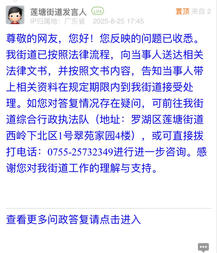 尊敬的網(wǎng)友,您好!您反映的問題已收悉。我街道已按照法律流程,向當(dāng)事人送達(dá)相關(guān)法律文書,并按照文書內(nèi)容,告知當(dāng)事人帶上相關(guān)資料在規(guī)定期限內(nèi)到我街道接受處理。如您對答復(fù)情況存在疑問,可前往我街道綜合行政執(zhí)法隊(duì)(地址:羅湖區(qū)蓮塘街道西嶺下北區(qū)1號翠苑家園4樓),或可直接撥打電話:0755-25732349進(jìn)行進(jìn)一步咨詢。感謝您對我街道工作的理解與支持。