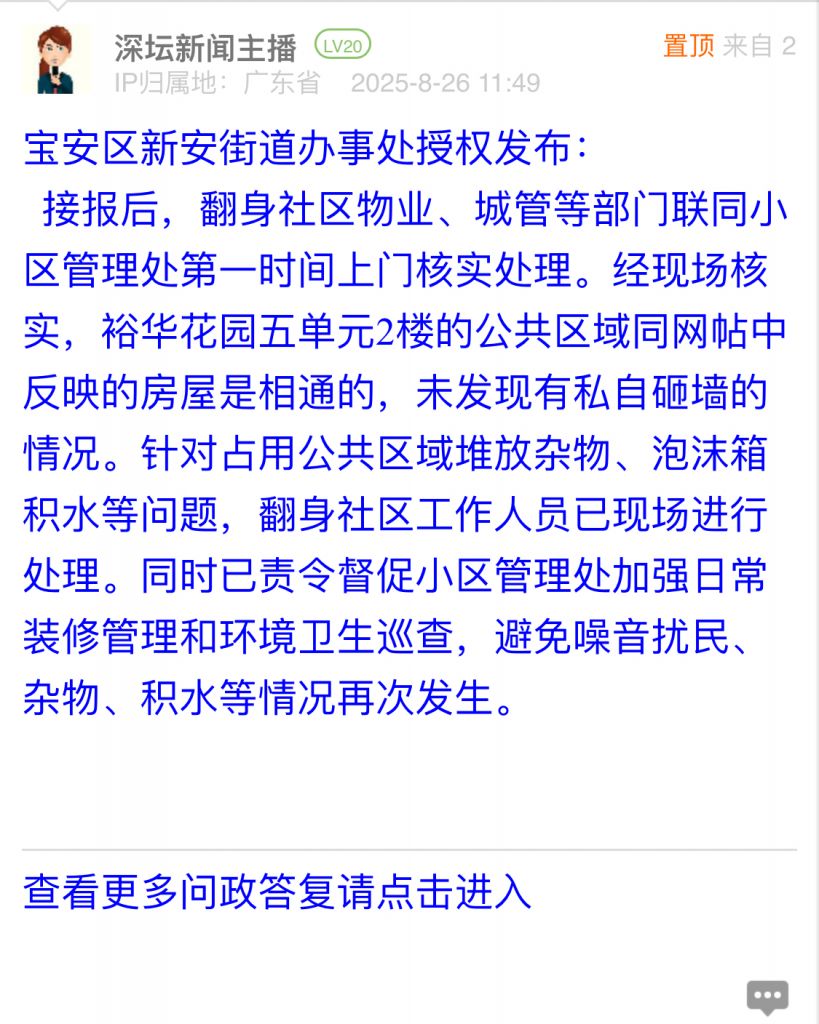 接報(bào)后,翻身社區(qū)物業(yè)、城管等部門聯(lián)同小區(qū)管理處第一時間上門核實(shí)處理。經(jīng)現(xiàn)場核實(shí),裕華花園五單元2樓的公共區(qū)域同網(wǎng)帖中反映的房屋是相通的,未發(fā)現(xiàn)有私自砸墻的情況。針對占用公共區(qū)域堆放雜物、泡沫箱積水等問題,翻身社區(qū)工作人員已現(xiàn)場進(jìn)行處理。同時已責(zé)令督促小區(qū)管理處加強(qiáng)日常裝修管理和環(huán)境衛(wèi)生巡查,避免噪音擾民、雜物、積水等情況再次發(fā)生。