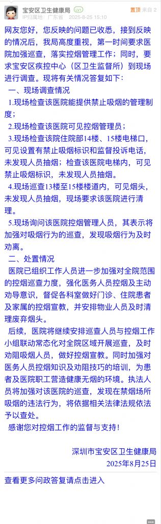 網(wǎng)友您好,您反映的問題已收悉,接到反映的情況后,我局高度重視,第一時間要求醫(yī)院加強(qiáng)巡查,落實(shí)控?zé)煿芾砉ぷ?;同時,要求寶安區(qū)疾控中心(區(qū)衛(wèi)生監(jiān)督所)到現(xiàn)場進(jìn)行調(diào)查?,F(xiàn)將有關(guān)情況答復(fù)如下: