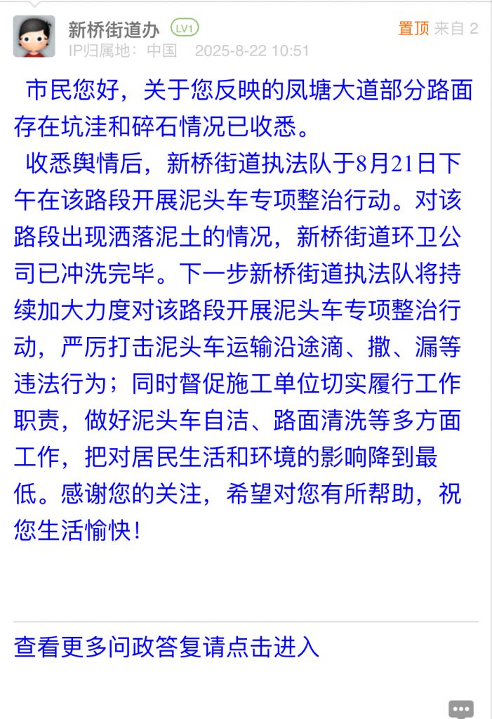 收悉輿情后,新橋街道執(zhí)法隊(duì)于8月21日下午在該路段開展泥頭車專項(xiàng)整治行動。對該路段出現(xiàn)灑落泥土的情況,新橋街道環(huán)衛(wèi)公司已沖洗完畢。下一步新橋街道執(zhí)法隊(duì)將持續(xù)加大力度對該路段開展泥頭車專項(xiàng)整治行動,嚴(yán)厲打擊泥頭車運(yùn)輸沿途滴、撒、漏等違法行為;同時督促施工單位切實(shí)履行工作職責(zé),做好泥頭車自潔、路面清洗等多方面工作,把對居民生活和環(huán)境的影響降到最低。感謝您的關(guān)注,希望對您有所幫助,祝您生活愉快!