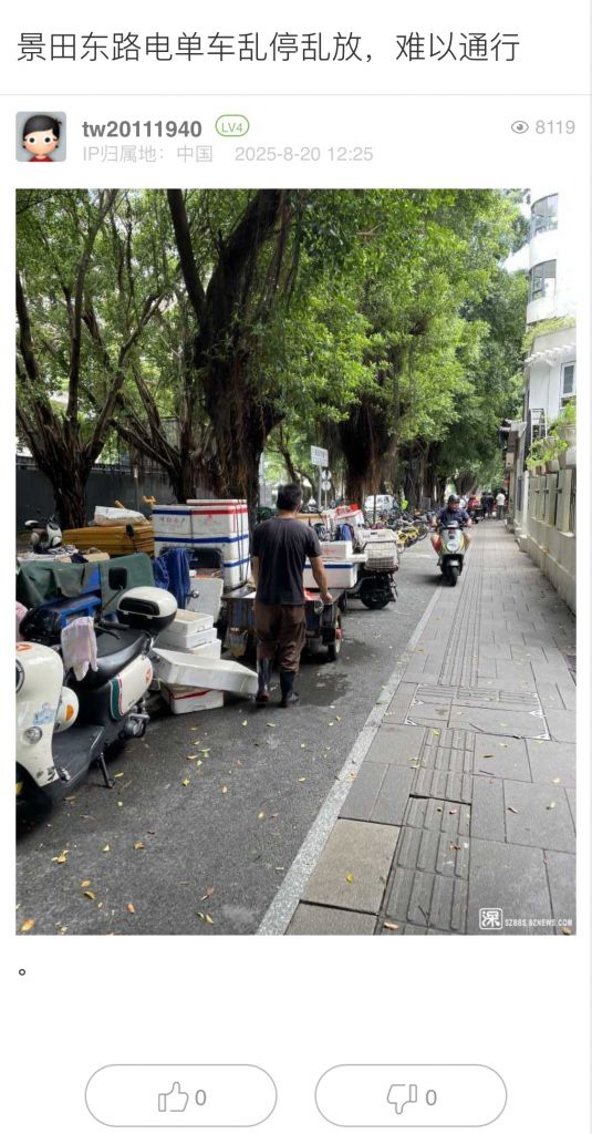 38. 帖文《寶安石巖街道人民醫(yī)院附近有非機(jī)動車道大量電雞與機(jī)動車車搶道》