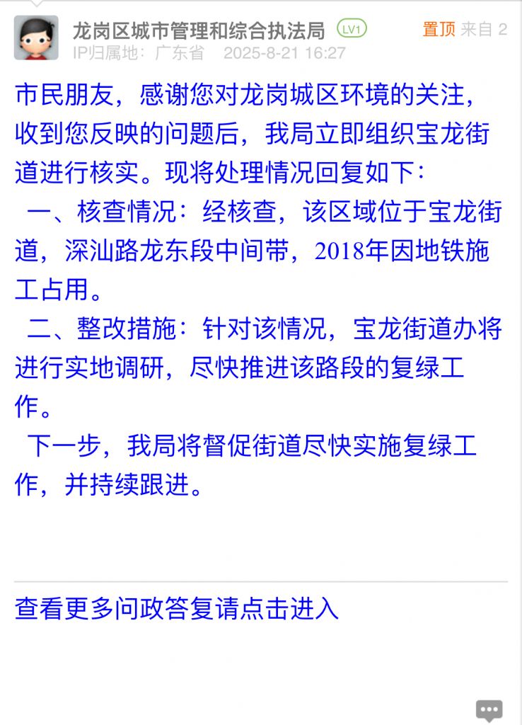 市民朋友,感謝您對龍崗城區(qū)環(huán)境的關(guān)注,收到您反映的問題后,我局立即組織寶龍街道進(jìn)行核實(shí)?,F(xiàn)將處理情況回復(fù)如下:
