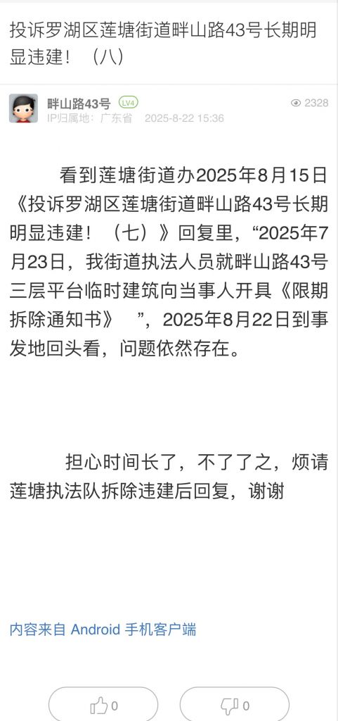 30. 帖文《投訴羅湖區(qū)蓮塘街道畔山路43號長期明顯違建?。ò耍?/a>》