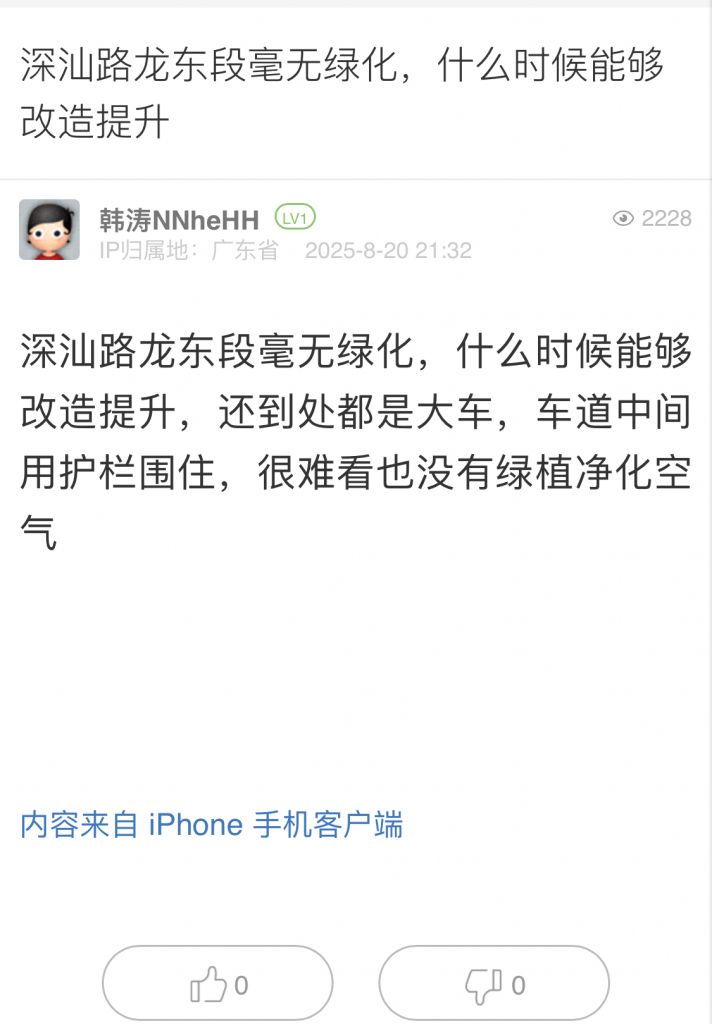 13. 帖文《深汕路龍東段毫無綠化,什么時候能夠改造提升》