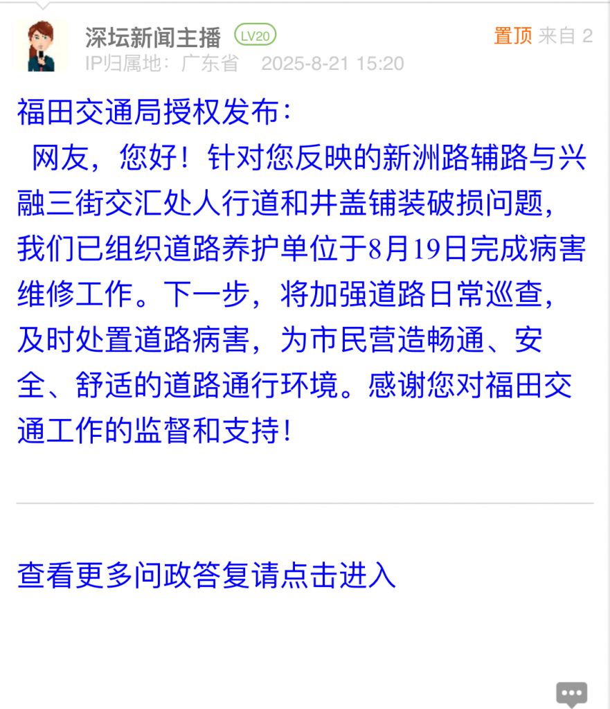 8. 帖文《福田中心區(qū)該路段人行道破損嚴(yán)重》
