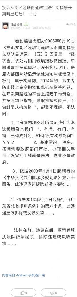 3. 帖文《投訴羅湖區(qū)蓮塘街道聚寶路仙湖楓景長期明顯違建?。ㄎ澹?/a>》