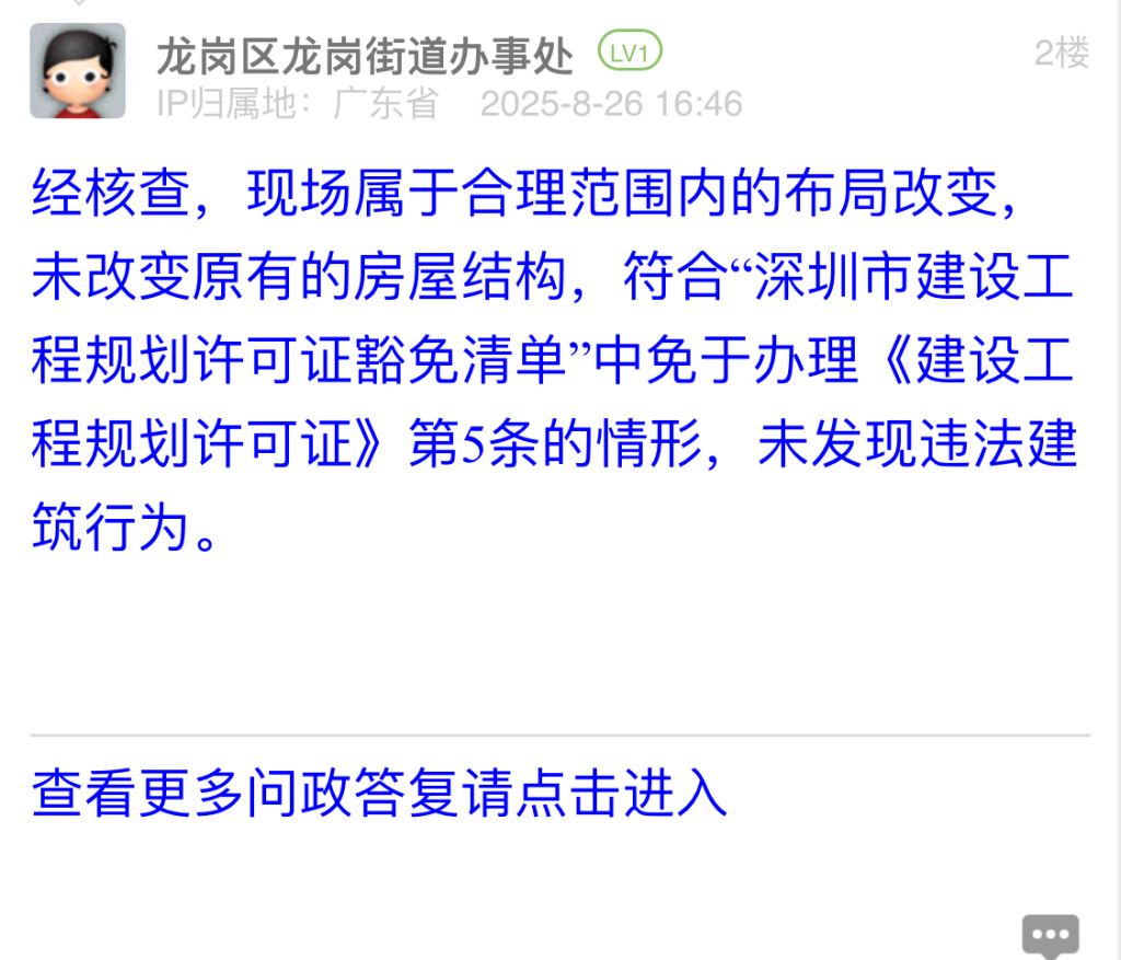 經(jīng)核查,現(xiàn)場屬于合理范圍內(nèi)的布局改變,未改變原有的房屋結(jié)構(gòu),符合“深圳市建設(shè)工程規(guī)劃許可證豁免清單”中免于辦理《建設(shè)工程規(guī)劃許可證》第5條的情形,未發(fā)現(xiàn)違法建筑行為。