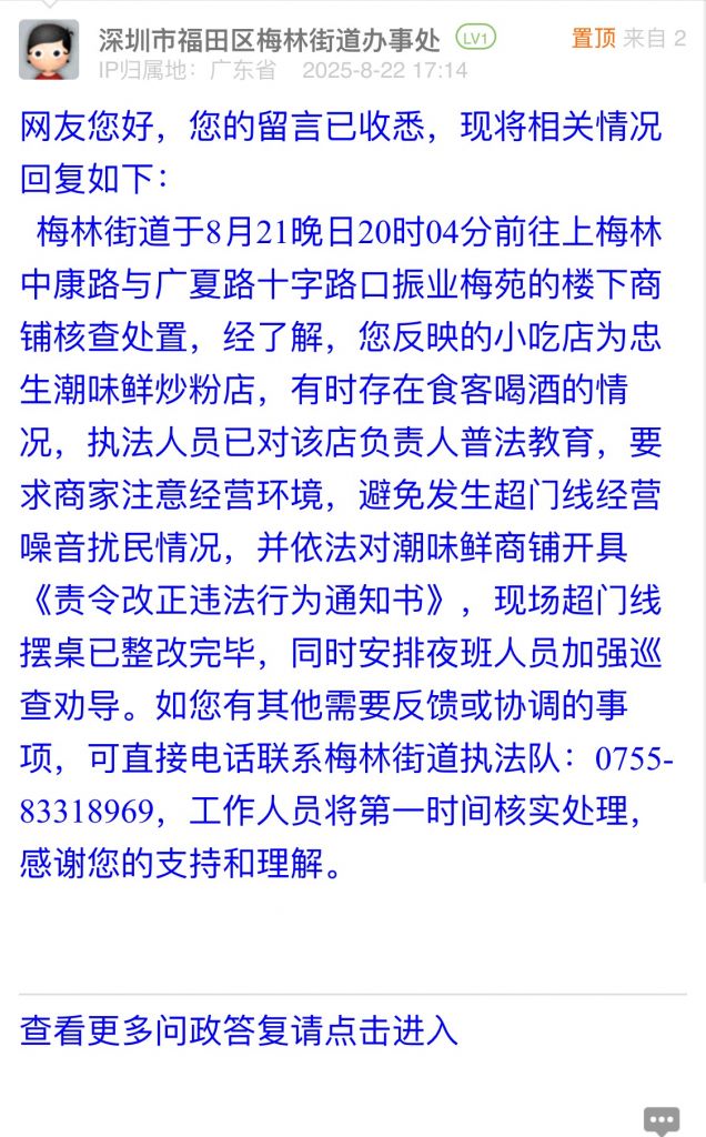 梅林街道于8月21晚日20時04分前往上梅林中康路與廣夏路十字路口振業(yè)梅苑的樓下商鋪核查處置,經(jīng)了解,您反映的小吃店為忠生潮味鮮炒粉店,有時存在食客喝酒的情況,執(zhí)法人員已對該店負(fù)責(zé)人普法教育,要求商家注意經(jīng)營環(huán)境,避免發(fā)生超門線經(jīng)營噪音擾民情況,并依法對潮味鮮商鋪開具《責(zé)令改正違法行為通知書》,現(xiàn)場超門線擺桌已整改完畢,同時安排夜班人員加強(qiáng)巡查勸導(dǎo)。如您有其他需要反饋或協(xié)調(diào)的事項(xiàng),可直接電話聯(lián)系梅林街道執(zhí)法隊(duì):0755-83318969,工作人員將第一時間核實(shí)處理,感謝您的支持和理解。