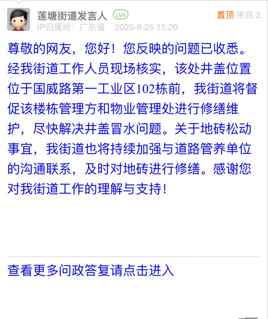 尊敬的網(wǎng)友,您好!您反映的問題已收悉。經(jīng)我街道工作人員現(xiàn)場核實(shí),該處井蓋位置位于國威路第一工業(yè)區(qū)102棟前,我街道將督促該樓棟管理方和物業(yè)管理處進(jìn)行修繕維護(hù),盡快解決井蓋冒水問題。關(guān)于地磚松動事宜,我街道也將持續(xù)加強(qiáng)與道路管養(yǎng)單位的溝通聯(lián)系,及時對地磚進(jìn)行修繕。感謝您對我街道工作的理解與支持!