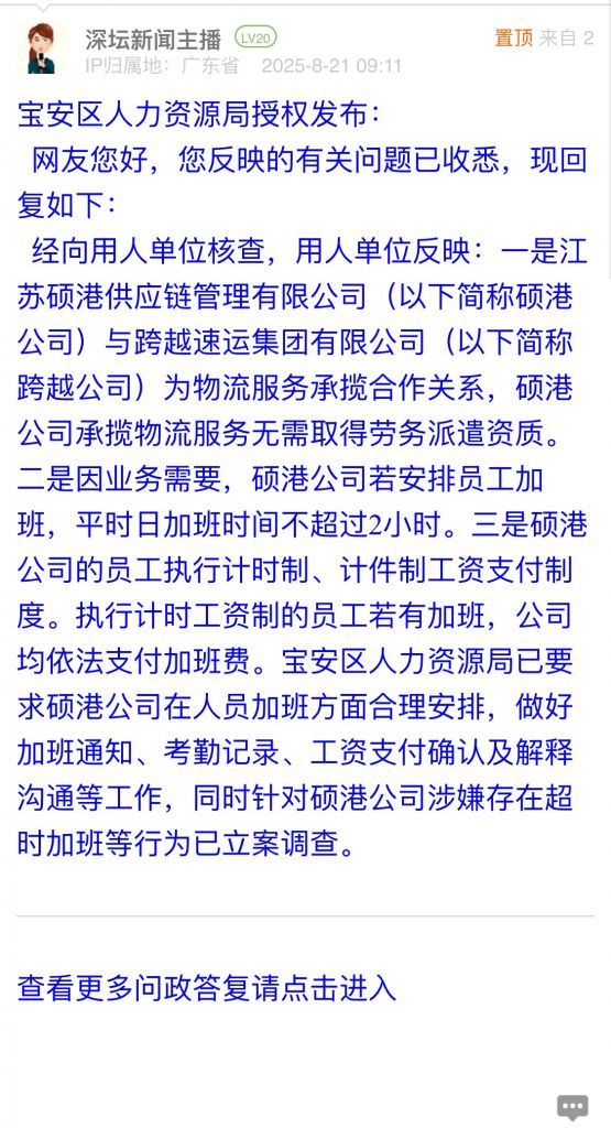 經(jīng)向用人單位核查,用人單位反映:一是江蘇碩港供應(yīng)鏈管理有限公司(以下簡稱碩港公司)與跨越速運(yùn)集團(tuán)有限公司(以下簡稱跨越公司)為物流服務(wù)承攬合作關(guān)系,碩港公司承攬物流服務(wù)無需取得勞務(wù)派遣資質(zhì)。二是因業(yè)務(wù)需要,碩港公司若安排員工加班,平時日加班時間不超過2小時。三是碩港公司的員工執(zhí)行計(jì)時制、計(jì)件制工資支付制度。執(zhí)行計(jì)時工資制的員工若有加班,公司均依法支付加班費(fèi)。寶安區(qū)人力資源局已要求碩港公司在人員加班方面合理安排,做好加班通知、考勤記錄、工資支付確認(rèn)及解釋溝通等工作,同時針對碩港公司涉嫌存在超時加班等行為已立案調(diào)查。