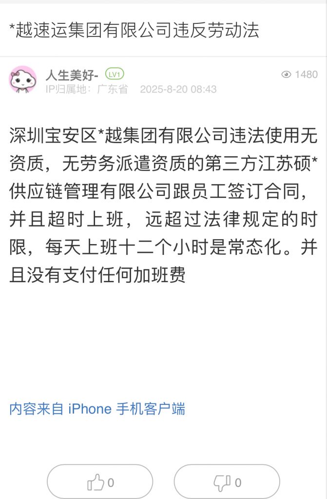 11. 帖文《*越速運(yùn)集團(tuán)有限公司違反勞動法》