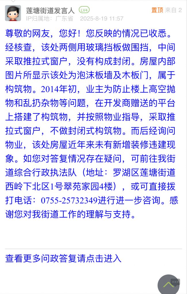 尊敬的網(wǎng)友,您好!您反映的情況已收悉。經(jīng)核查,該處兩側(cè)用玻璃擋板做圍擋,中間采取推拉式窗戶,沒有構(gòu)成封閉。房屋內(nèi)部圖片所顯示該處為泡沫板墻及木板門,屬于構(gòu)筑物。2014年初,業(yè)主為防止樓上高空拋物和亂扔雜物等問題,在開發(fā)商贈送的平臺上搭建了構(gòu)筑物,并按照物業(yè)指導(dǎo),采取推拉式窗戶,不做封閉式構(gòu)筑物。而后經(jīng)詢問物業(yè),該處房屋近年來未有新增裝修違建現(xiàn)象。如您對答復(fù)情況存在疑問,可前往我街道綜合行政執(zhí)法隊(duì)(地址:羅湖區(qū)蓮塘街道西嶺下北區(qū)1號翠苑家園4樓),或可直接撥打電話:0755-25732349進(jìn)行進(jìn)一步咨詢。感謝您對我街道工作的理解與支持。