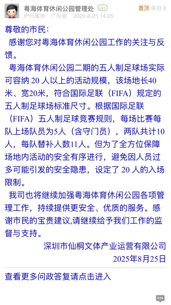 我司也將繼續(xù)加強(qiáng)粵海體育休閑公園各項(xiàng)管理工作,持續(xù)提供更安全、優(yōu)質(zhì)的服務(wù)。感謝市民的寶貴建議,請繼續(xù)給予我們工作的監(jiān)督與支持。