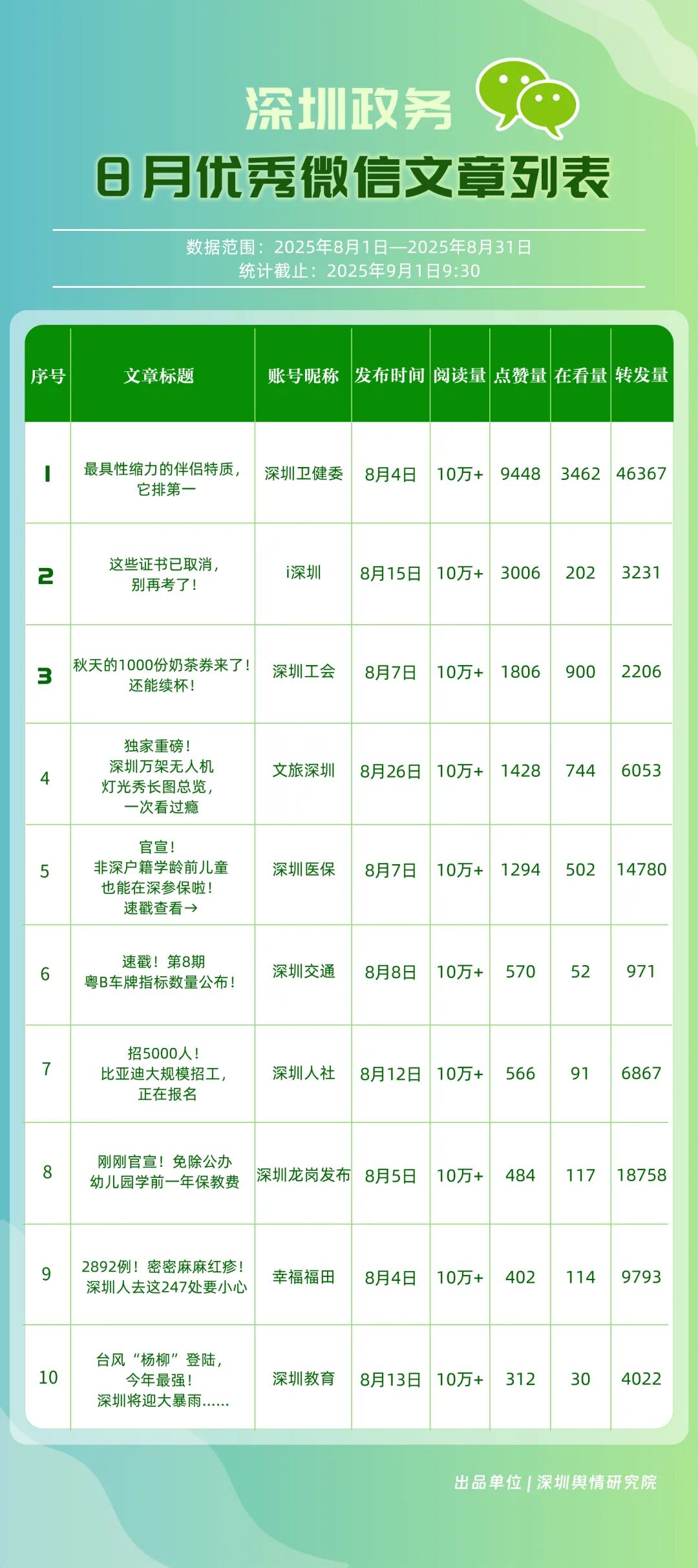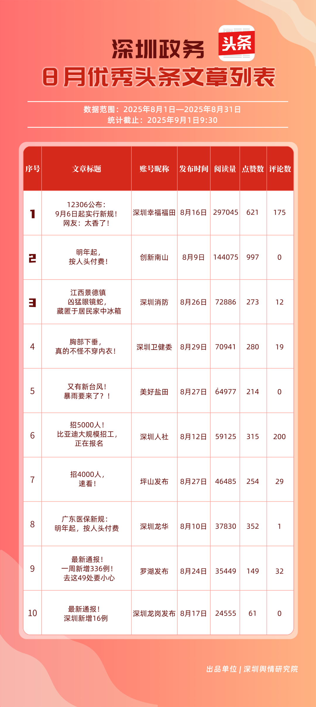 8月,“深圳幸福福田”“深圳消防”“深圳衛(wèi)健委”“創(chuàng)新南山”“深圳人社”“羅湖發(fā)布”“深圳龍崗發(fā)布”“深圳龍華”“青春深圳”“坪山發(fā)布”共10個(gè)政務(wù)頭條號入選“優(yōu)秀政務(wù)頭條號”榜單?!吧钲谛腋8L铩睉{借持續(xù)優(yōu)異的綜合表現(xiàn),以滿分成績穩(wěn)居榜單首位,彰顯出強(qiáng)大的政務(wù)傳播力與影響力;“深圳消防”“深圳衛(wèi)健委”則以穩(wěn)定的內(nèi)容質(zhì)量與深厚的民眾基礎(chǔ),持續(xù)為市民提供權(quán)威、及時(shí)的服務(wù)信息,排名穩(wěn)固?!皠?chuàng)新南山”“深圳人社”等上榜賬號亦表現(xiàn)亮眼,聚焦民生服務(wù)傳遞政策溫度,共同構(gòu)成政務(wù)新媒體矩陣的中堅(jiān)力量,為城市治理與民生服務(wù)注入鮮活動(dòng)能。
