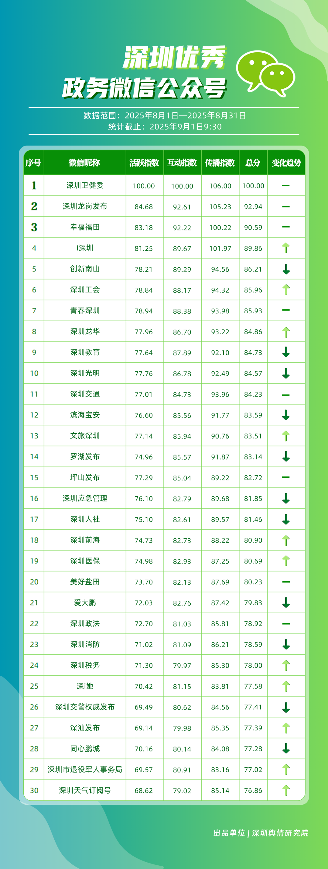 8月,30個(gè)政務(wù)微信公眾號入選“深圳優(yōu)秀政務(wù)微信公眾號”榜單,其中包括“深圳衛(wèi)健委”“深圳龍崗發(fā)布”“幸福福田”“i深圳”“創(chuàng)新南山”“深圳工會(huì)”“青春深圳”“深圳龍華”“深圳教育”“深圳光明”等。8月,“深圳衛(wèi)健委”66篇推文獲得超10萬次閱讀,以滿分位于榜單首位;“深圳龍崗發(fā)布”積極傳遞民生信息,依托區(qū)域活動(dòng)開展宣傳,推動(dòng)傳播效果顯著提升,位居第二;“幸福福田”關(guān)注區(qū)域發(fā)展動(dòng)態(tài),排名第三。“i深圳”“創(chuàng)新南山”“深圳工會(huì)”“青春深圳”等政務(wù)賬號在信息發(fā)布中不斷提升內(nèi)容豐富性,深耕優(yōu)質(zhì)服務(wù),評分在85分以上。上榜微信公眾號立足自身特色優(yōu)勢,以精品內(nèi)容為核心競爭力,在政務(wù)傳播領(lǐng)域樹立了標(biāo)桿形象,成為兼具影響力與公信力的示范樣本。