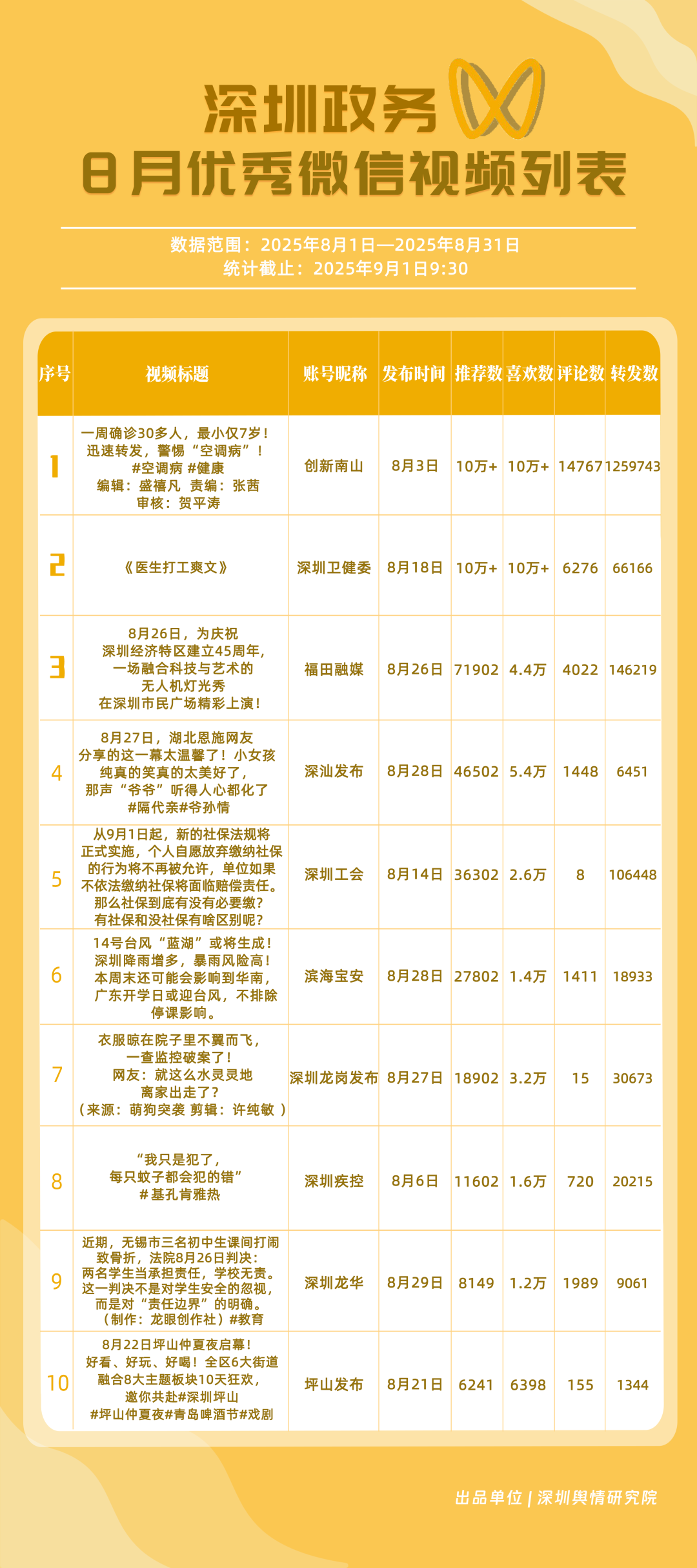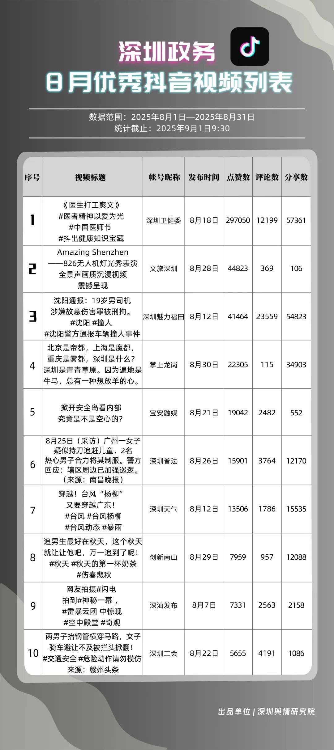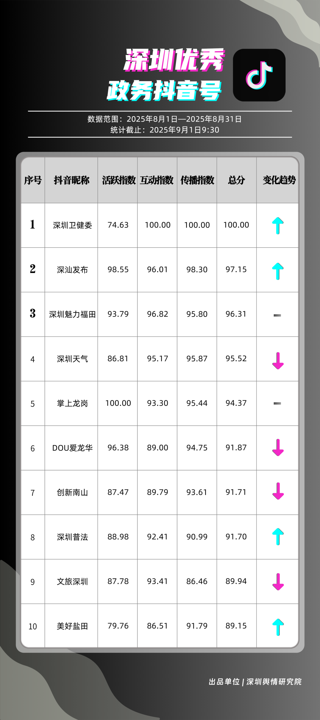 8月,“深圳衛(wèi)健委”“深汕發(fā)布”“深圳魅力福田”“深圳天氣”“掌上龍崗”“DOU愛龍華”“創(chuàng)新南山”“深圳普法”“文旅深圳”“美好鹽田”共10個(gè)政務(wù)抖音號獲得“優(yōu)秀政務(wù)抖音號”稱號?!吧钲谛l(wèi)健委”內(nèi)容吸引大量網(wǎng)民關(guān)注,4條視頻累計(jì)獲得超50萬次點(diǎn)贊,排名從上期的第九名上升至第一名;“深汕發(fā)布”憑借較高的傳播指數(shù)評分,位列第二名,排名有所上升?!吧钲邝攘ΩL铩薄吧钲谔鞖狻钡荣~號緊隨其后,得分均在95分左右。上榜的優(yōu)秀政務(wù)抖音號深耕優(yōu)質(zhì)創(chuàng)作,精準(zhǔn)把握網(wǎng)民興趣點(diǎn),使作品收獲高點(diǎn)贊、高轉(zhuǎn)發(fā),推動(dòng)評論區(qū)形成良性互動(dòng)氛圍,以優(yōu)秀內(nèi)容提升政務(wù)傳播效能。
