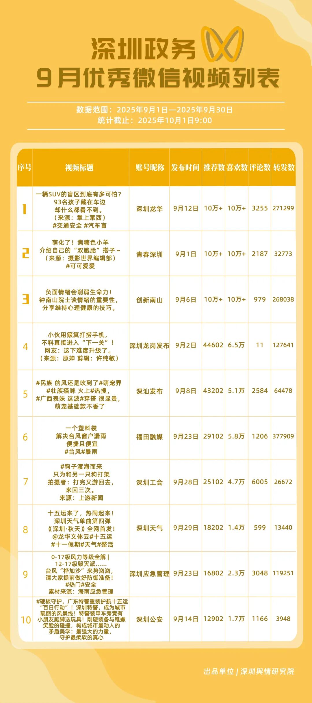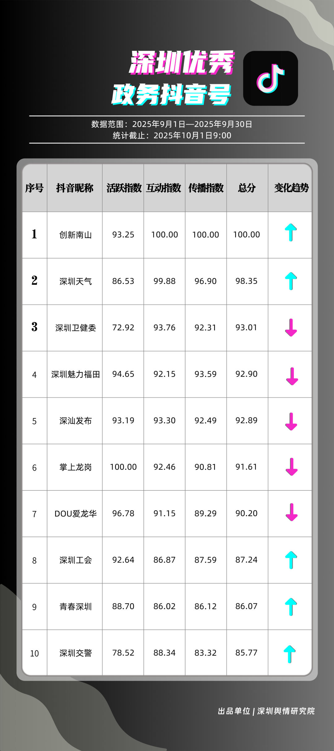 9月,深圳政務新媒體矩陣持續(xù)優(yōu)化內(nèi)容生態(tài),各單位依托平臺特色深化服務效能,南山區(qū)、市衛(wèi)生健康委員會、市氣象局(臺)、龍崗區(qū)、福田區(qū)、龍華區(qū)、深汕特別合作區(qū)、市應急管理局、中國共產(chǎn)主義青年團深圳市委員會、光明區(qū)的新媒體矩陣入選“深圳優(yōu)秀政務新媒體矩陣”榜單。9月,南山區(qū)在短視頻平臺表現(xiàn)突出,抖音、微信視頻號平臺均獲滿分;市衛(wèi)生健康委員會輸出深度內(nèi)容,位列榜單第二;市氣象局(臺)新媒體矩陣居于榜單第三,在9月發(fā)布臺風相關天氣提醒,獲得公眾廣泛關注。此外,龍崗區(qū)、福田區(qū)、龍華區(qū)、深汕特別合作區(qū)新媒體矩陣持續(xù)推出優(yōu)質(zhì)內(nèi)容,共同展現(xiàn)了深圳在塑造現(xiàn)代化形象、提升數(shù)字治理能力上的創(chuàng)新引領作用。