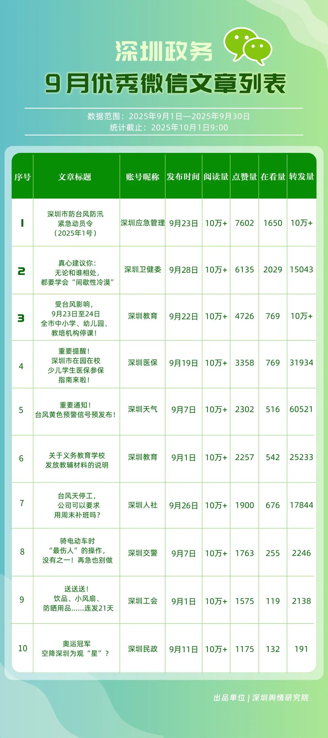 9月,“深圳衛(wèi)健委”“深圳龍崗發(fā)布”“幸福福田”“i深圳”“青春深圳”“深圳工會”“深圳教育”“深圳交通”“創(chuàng)新南山”“深圳應急管理”等30個政務微信公眾號榮登“深圳優(yōu)秀政務微信公眾號”榜單。9月,“深圳衛(wèi)健委”以總分100.00的成績蟬聯(lián)榜單首位,其憑借突破常規(guī)視角的選題,解讀專業(yè)健康知識,引發(fā)大量網(wǎng)民共鳴,內(nèi)容質(zhì)量與傳播力形成雙向賦能;“深圳龍崗發(fā)布”以總分93.24位居第二,聚焦區(qū)域民生服務升級等動態(tài),信息觸達率不斷提升;“幸福福田”圍繞商圈經(jīng)濟復蘇、文化節(jié)慶活動等主題開展系列宣傳,增強區(qū)域活力展示,位列第三;“i深圳”“青春深圳”“深圳工會”等也持續(xù)優(yōu)化賬號內(nèi)容,通過實用信息推送強化政務服務定位。
